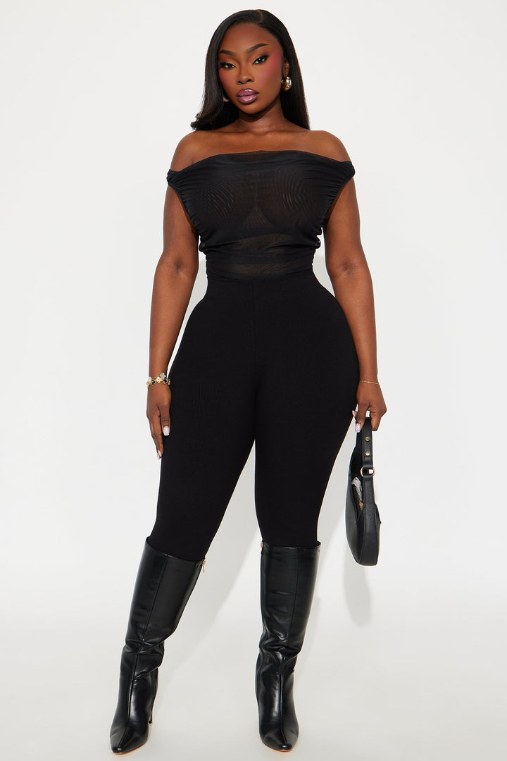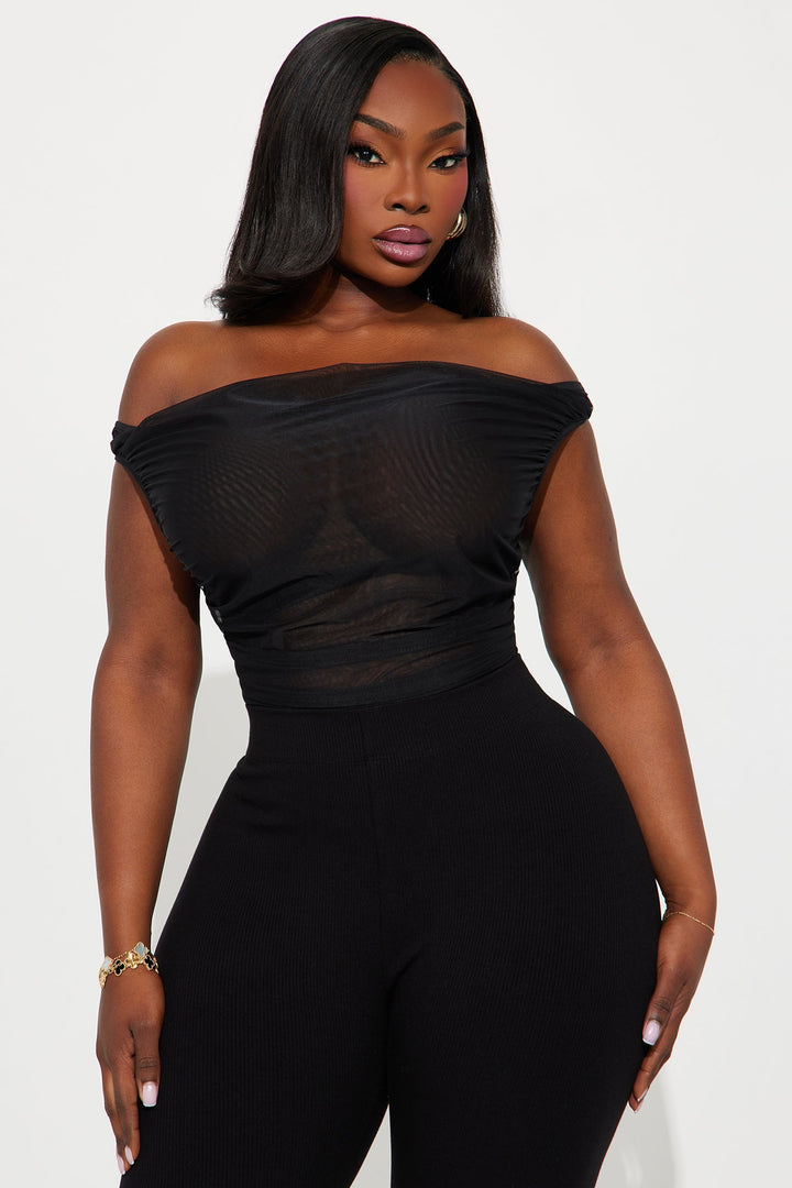 Available In Black. | Mesh Bodysuit | Of Shoulder | Sleevless | Ruched | Sheer | Double Lined | Thong Bottom | Snap Button Closure | Stretch | Final Sale | Self: 85% Polyester 15% Spandex | Lining: 85% Polyester 15% Spandex | Imported