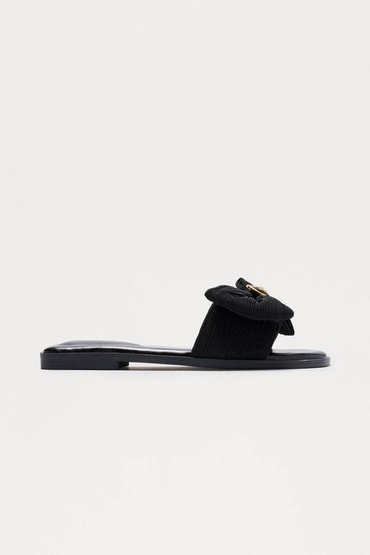 Available In Black. | Flat Sandals | Slip On | Bow Detail | Hardware Detail | Square Toe | Flat Heel | Imported