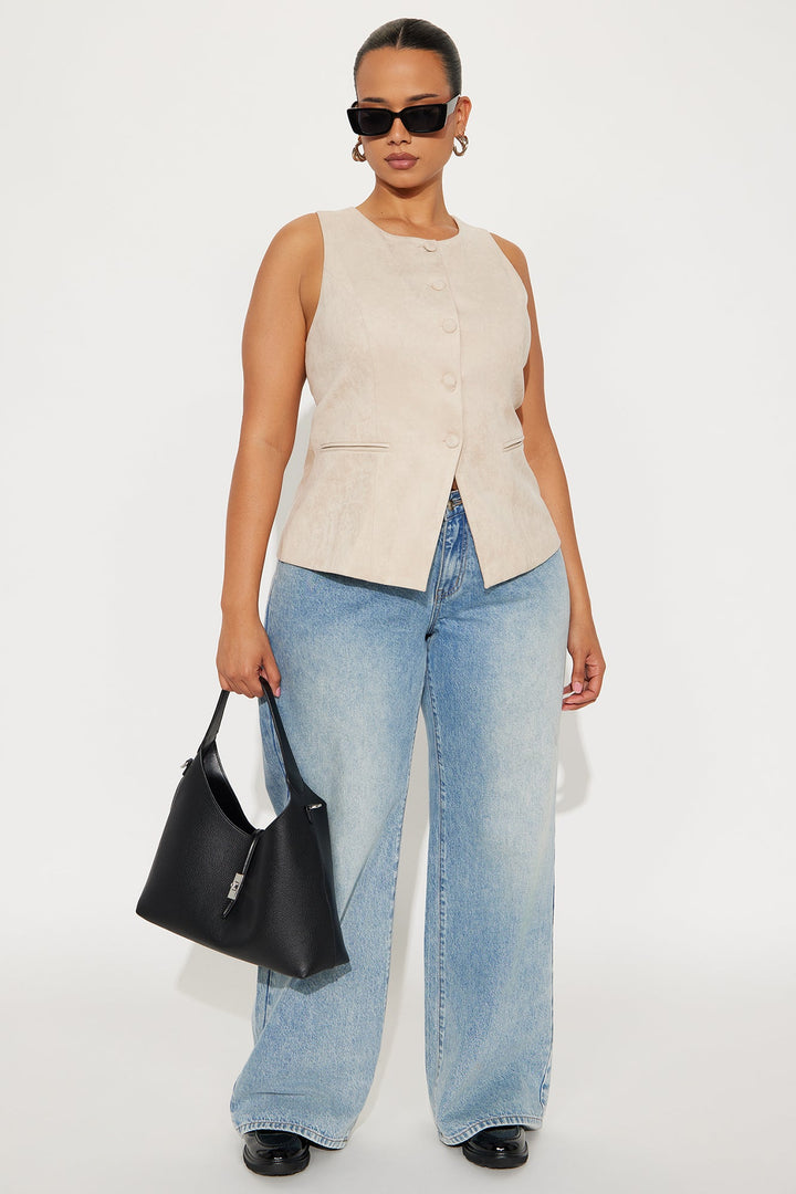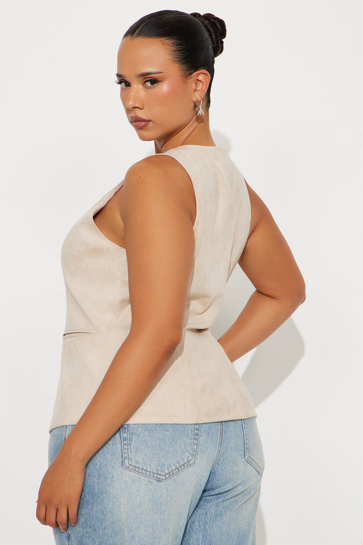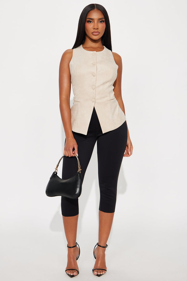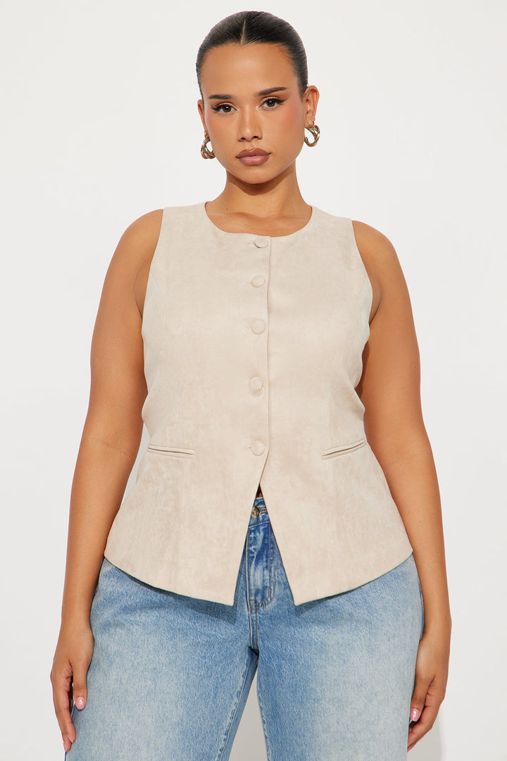 Available In Stone And Wine. | Vest Top | Crew Neck | Sleeveless | Faux Suede | Button Down | Non Stretch | Self: 90% Polyester 10% Spandex | Lining: 100% Polyester | Imported
