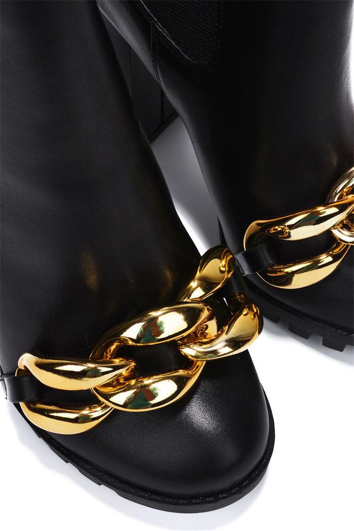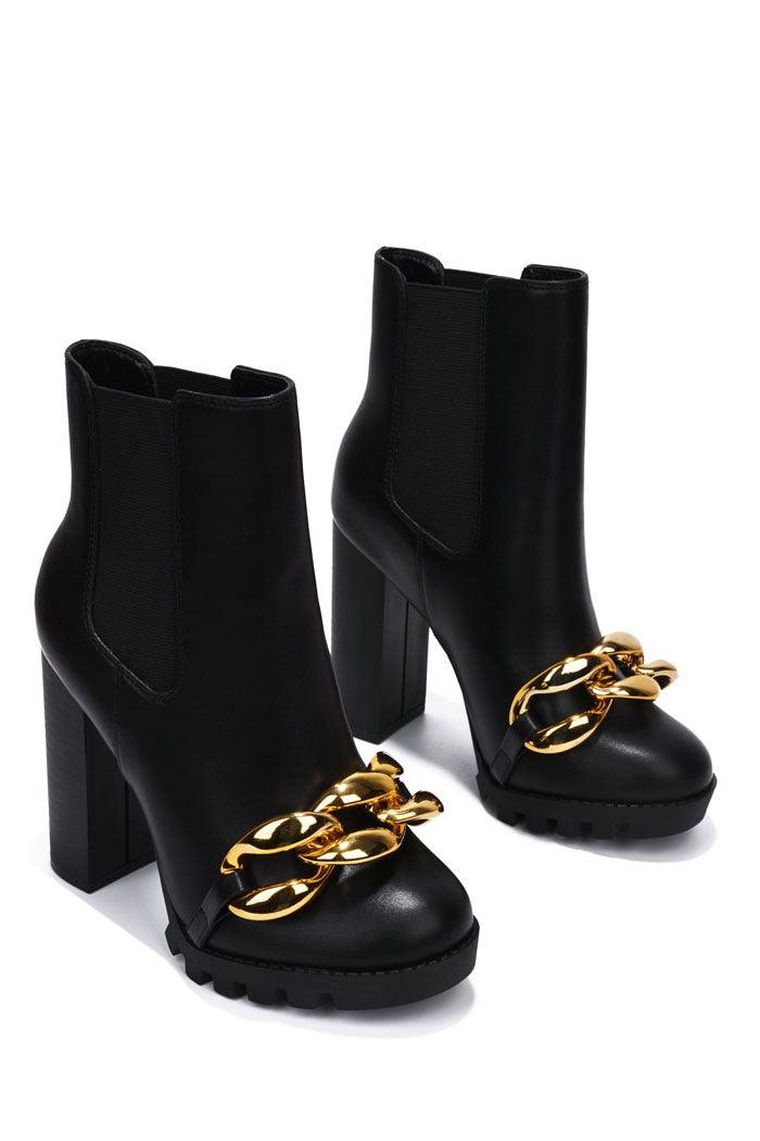 GODZILLA - BLACK - BOOTIES by CAPE ROBBIN round toe high block heels lug chain trim Show off your unique style with these Godzilla black booties. A high block heel and lug sole provide superior traction,while the chain trim adds an edgy detail. The classic silhouette and modern details make these shoes the perfect combination of style and comfort.
