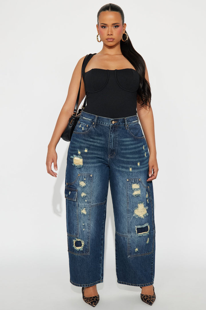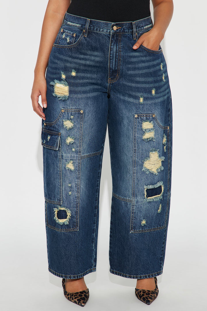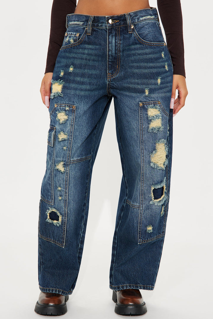 Available In Dark Wash. | Loose Fit | 5 Pocket | Distressed | Cargo Utility Details | 12'' Rise | 28" Inseam | Non-Stretch | Disclaimer -Due To The Specialized Wash & Distressing Process, Each Garment Is Unique. | 100% Cotton | Imported