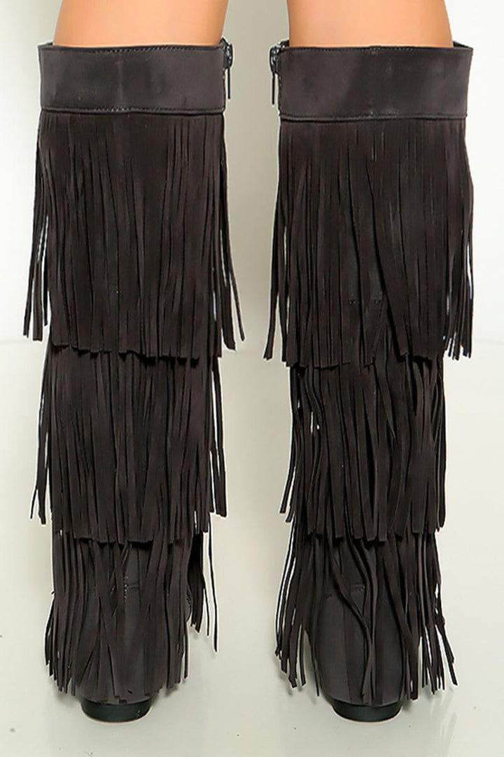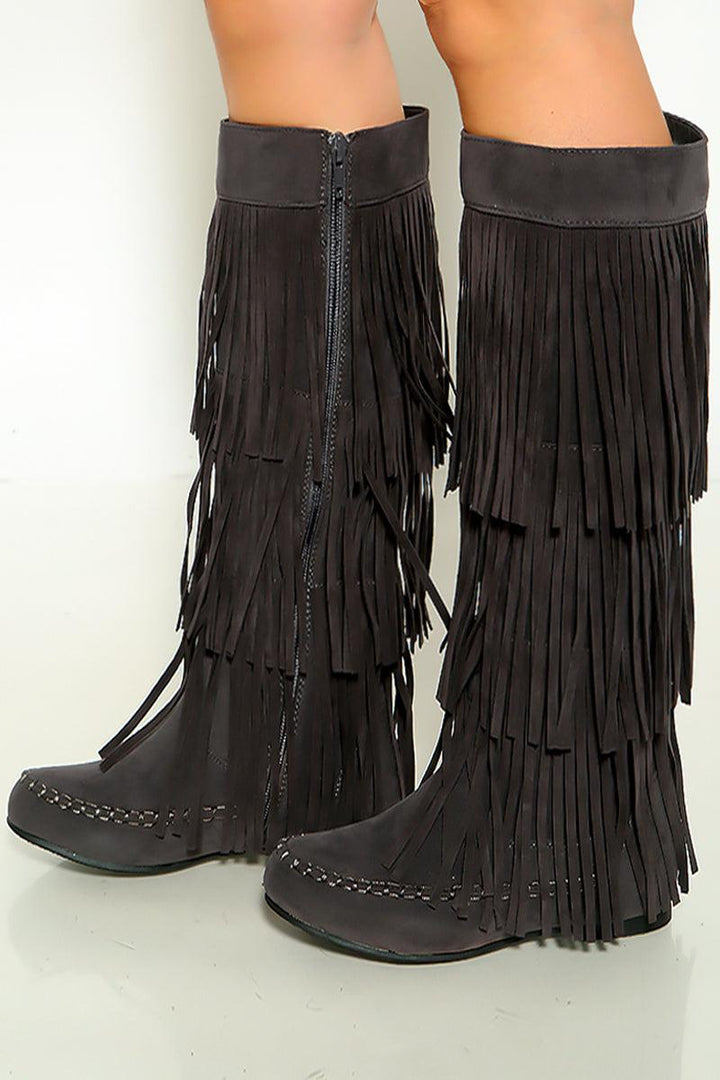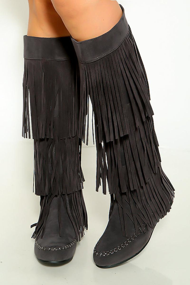 Gray Moccasin Fringe Knee High Suede Flat Boots. Featuring 3 rows of fringe