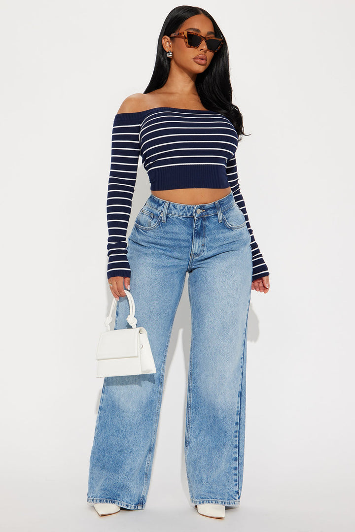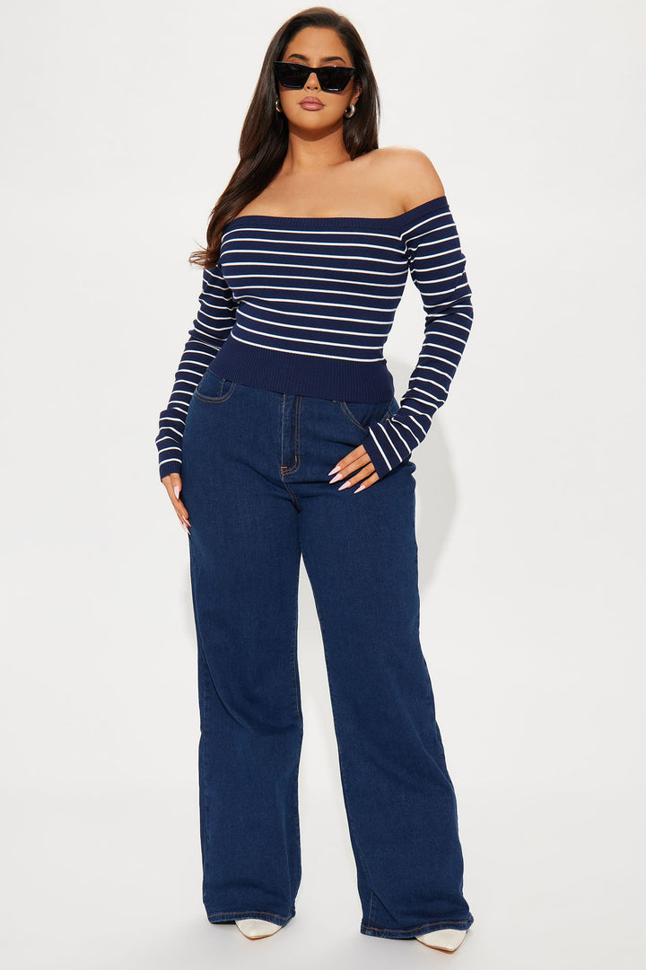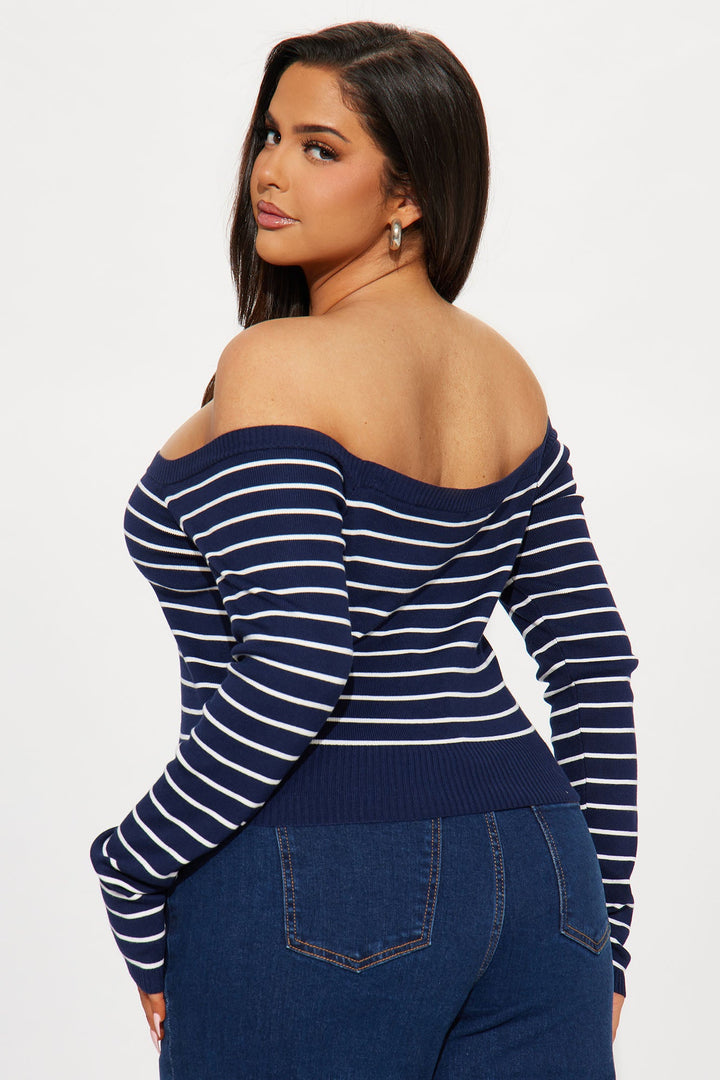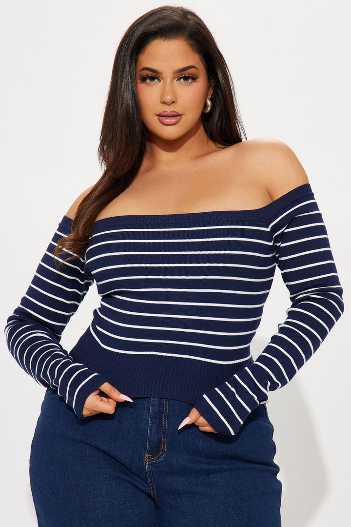 Available In Navy/combo, Red/White And White/combo. | Striped Pullover Sweater | Long Sleeve | Off Shoulder | Cropped | Ribbed Hem | 80% Rayon 20% Nylon | Imported