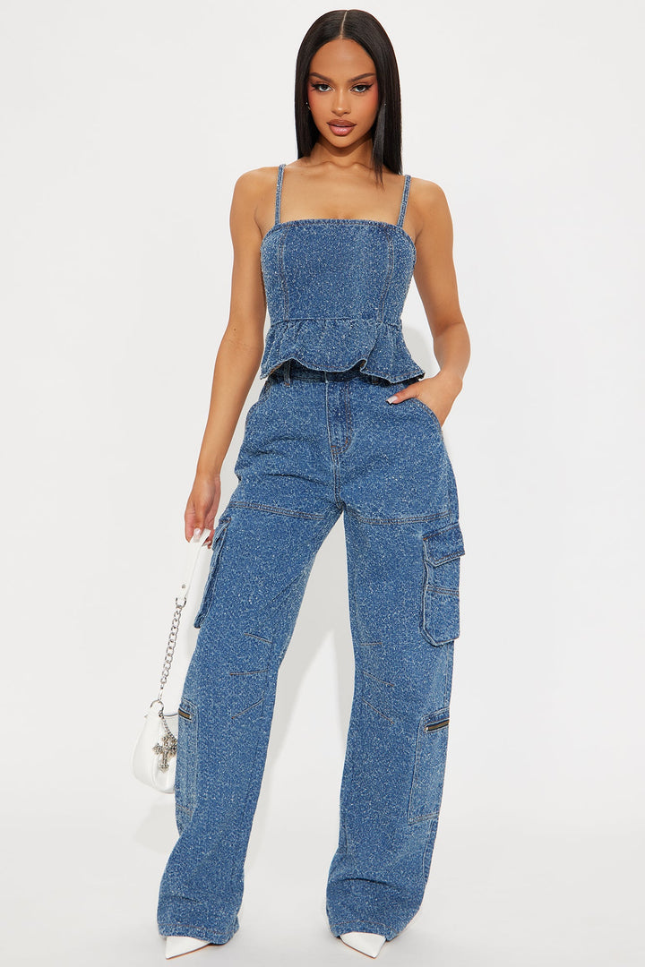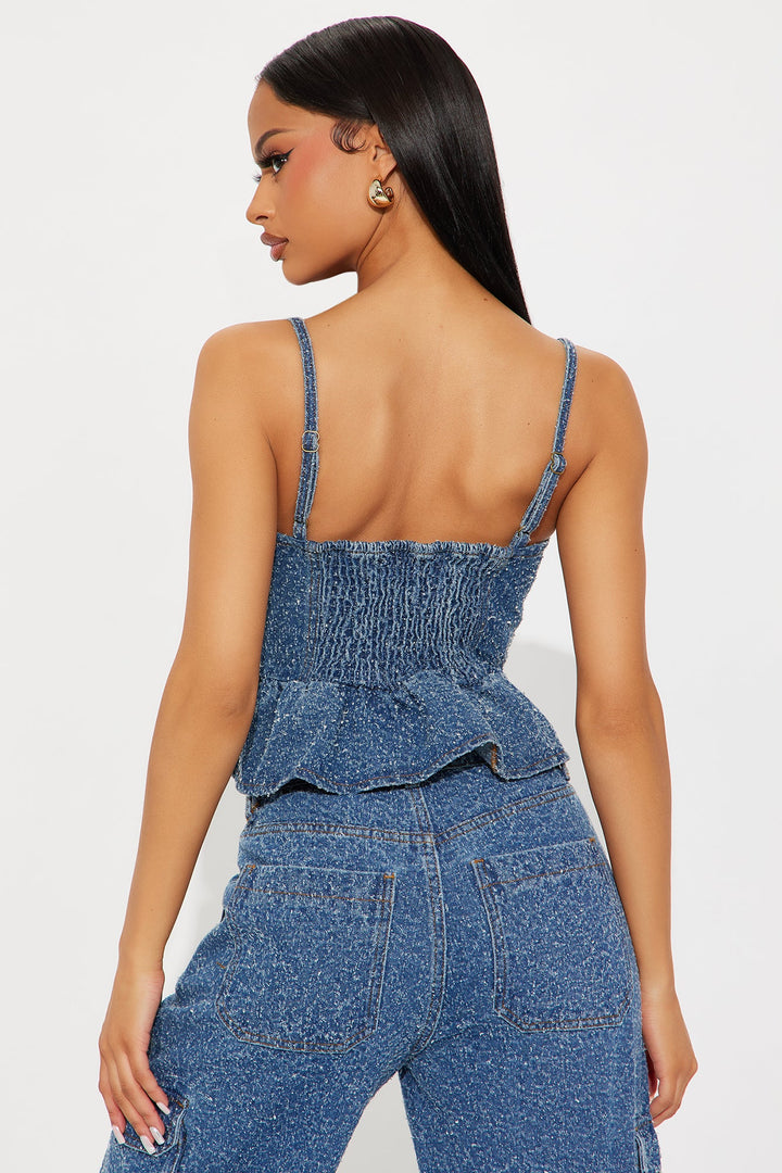 Available In Medium Wash. | Pair With "Hanna Textured Cargo Straight Leg Jean" | Denim Peplum Top | Adjustable Straps | Non Stretch | Smocked Back | Side Zipper | Self:75%Cotton 25%Polyester | Imported
