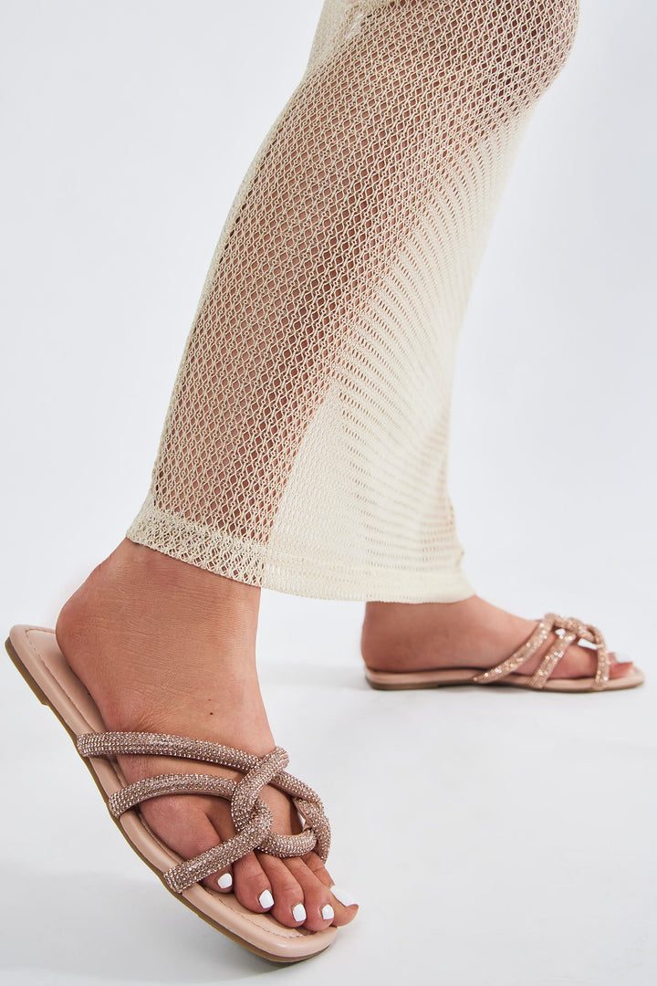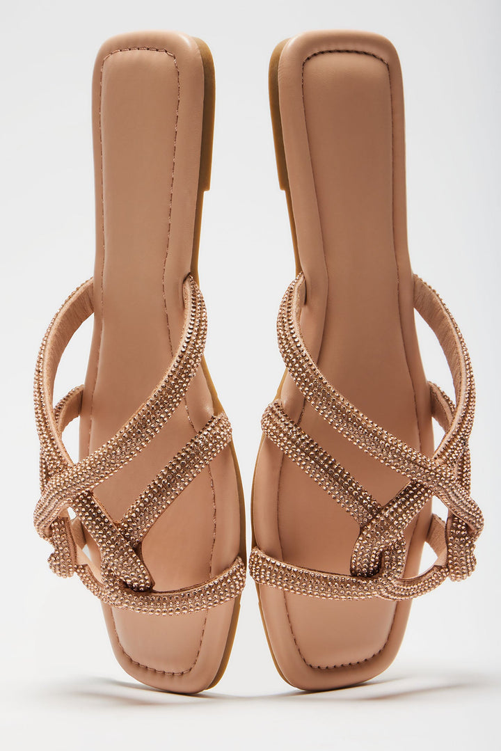 Available In Nude. | Flat Sandals | Rhinestone Embellishment | Square Toe | Flat Heel | Imported