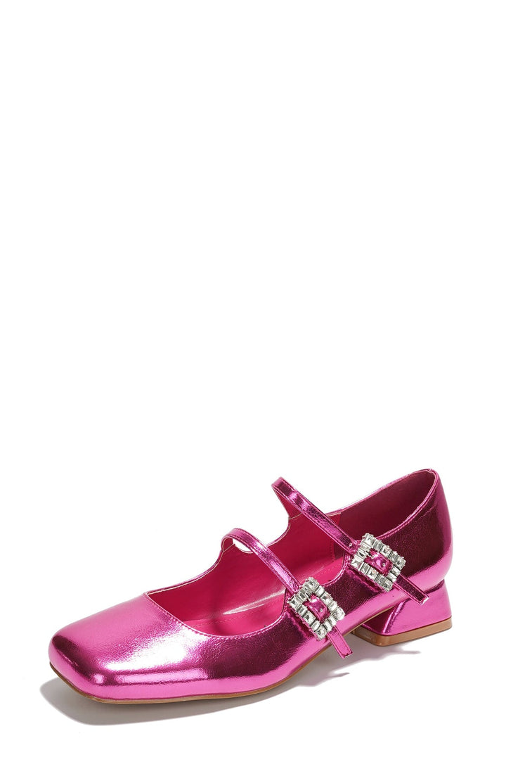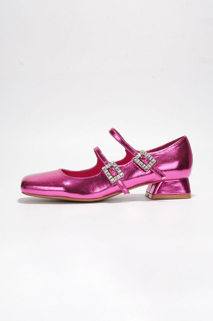 HARRI - PINK - HEELS by CAPE ROBBIN Height: 1-inch Buckle closure Rhinestone buckle PU leather insole with memory foam for added comfort Square toe The Harri heels feature a classic Mary Jane silhouette with a modern twist, these shoes boast a luxurious metallic leather finish that shines with every step. The double buckle straps adorned with sparkling rhinestones add a touch of glamour. Add a touch of timeless elegance to your wardrobe with the Harri Mary Jane Shoes. Whether you're attending a special event, going to work, or simply stepping out in style, these shoes will ensure you do it with grace and sophistication.