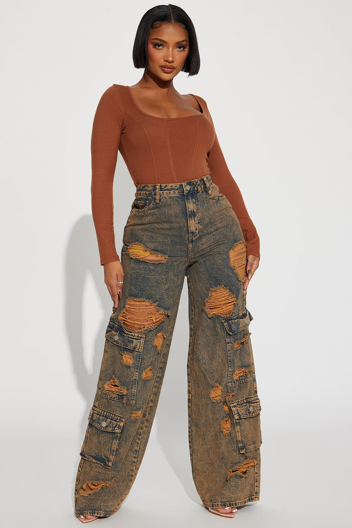 Available In Brown. | Square Neck | Long Sleeve | Ribbed | Stretch | 93% Rayon 7% Spandex | Imported