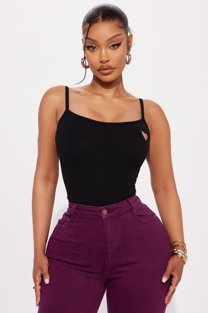 Available In Black. | Ribbed Bodysuit | Stretch | Adjustable Straps | Hardware | Cut Out | Cheeky Bottom | Snap Closure | Final Sale | Self: 92% Rayon 8% Spandex | Imported