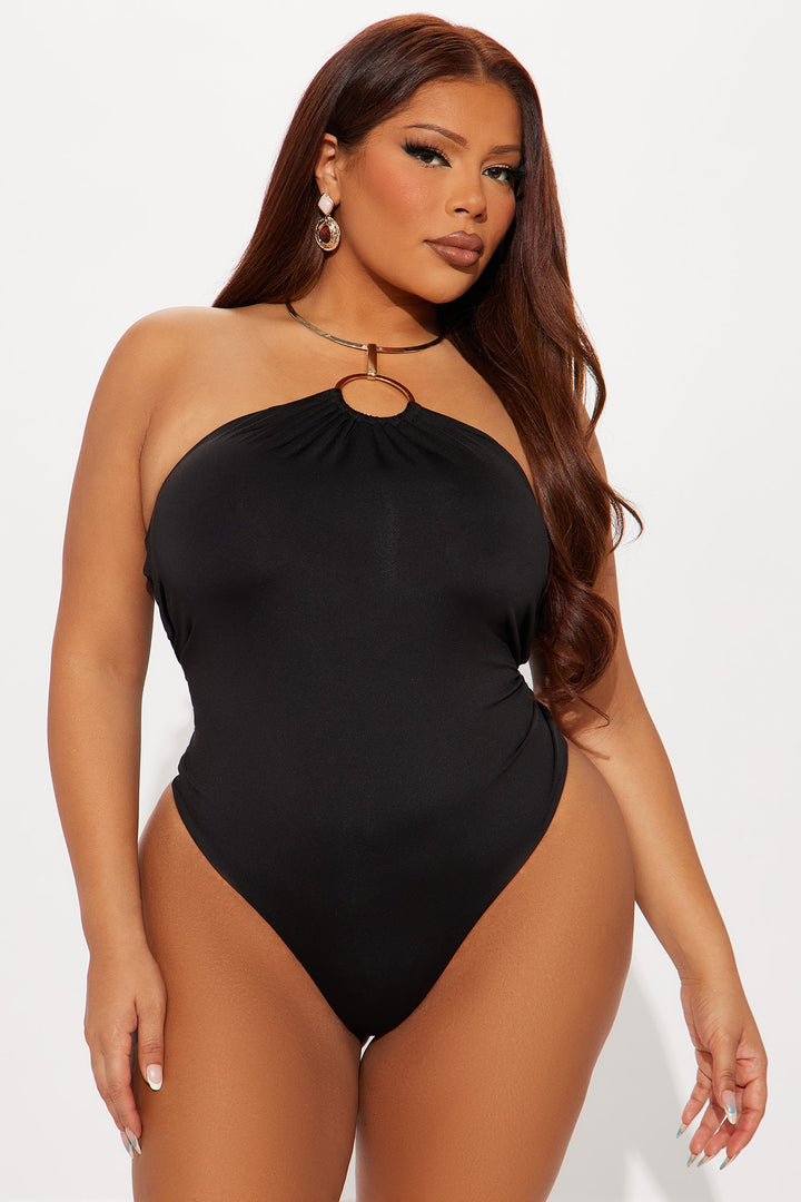 Available In Black And Red. | Halter Bodysuit | Stretch | Hardware | Chain Strap | Ruched Detail | Double Lined Front | Cheeky Bottom | Snap Closure | Final Sale | Self: 90% Polyester 10% Spandex | Lining: 90% Polyester 10% Spandex | Imported