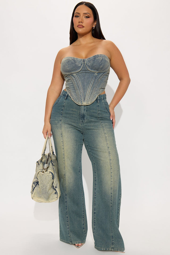 Available In Light Wash And Vintage Wash. | Pair With High Value Cropped Denim Vest | Wide Leg Jean | Trouser Pocket | Seaming | 11" High Rise | 34" Inseam | Medium Stretch | 99% Cotton 1% Spandex | Imported