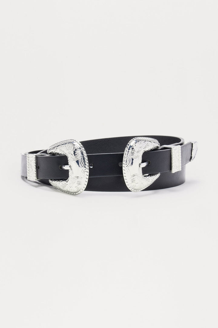 Available In Black. | Faux Leather Material | Double Buckle Detail | Hardware Detail | Imported