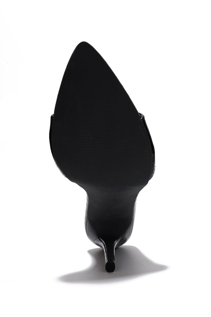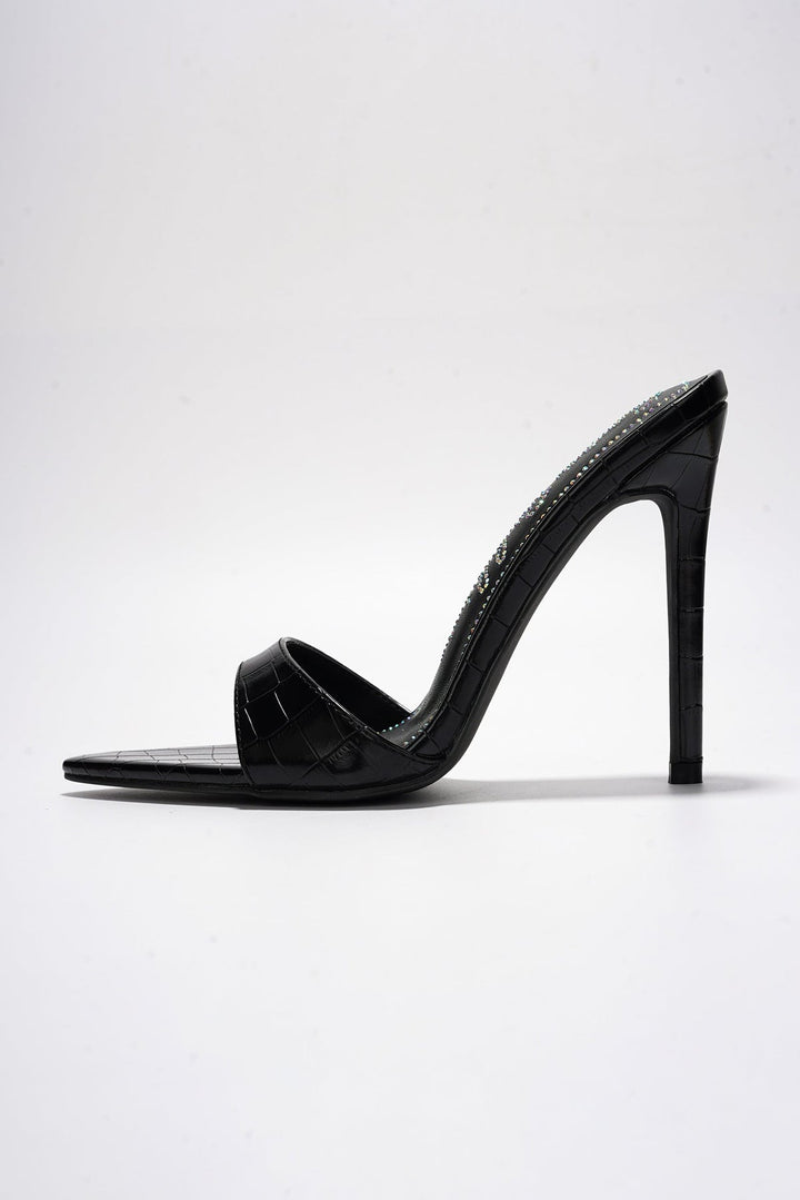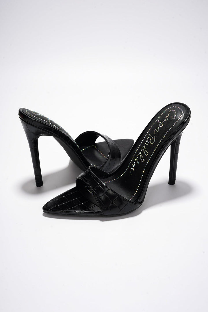 HOLLY - BLACK - HEELS by CAPE ROBBIN Stiletto heel: 4-inch Slip on PU leather insole with memory foam cushioning Croc print Pointy toe The Holly croc print stilleto heels features a sleek silhouette and a fashionable croc print. The minimalist design ensures a modern and chic look, versatile enough to pair effortlessly with casual jeans or elegant dresses. The Holly Croc Print Stiletto Heel Mules are a must-have for fashion-forward individuals, perfect for any occasion from casual outings to formal events.
