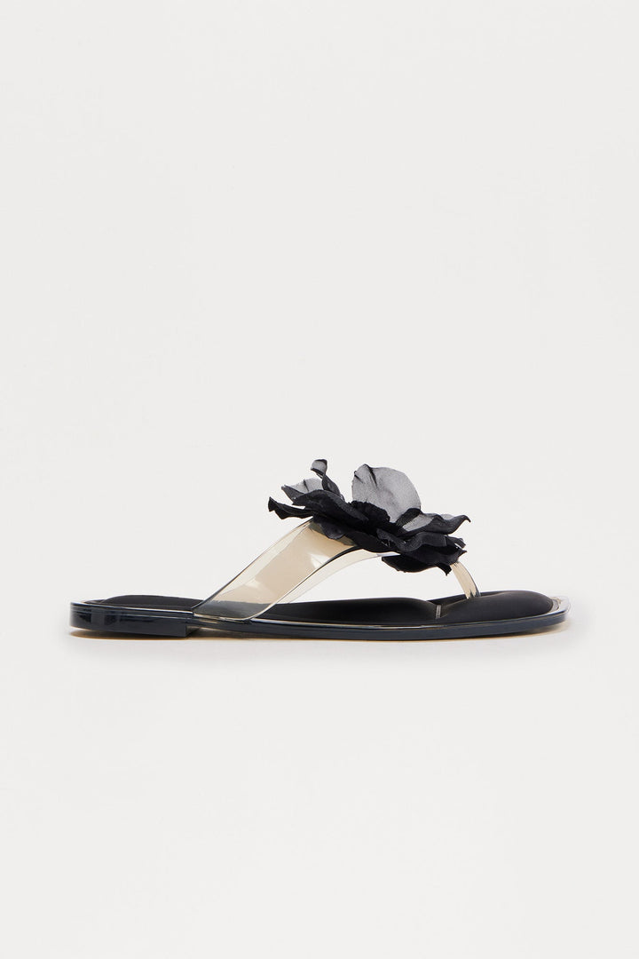 Available In Black, Pink, Purple And White. | Flat Sandals | Flip Flops | Flower 3D Applique | Square Toe | Flat Heel | Imported