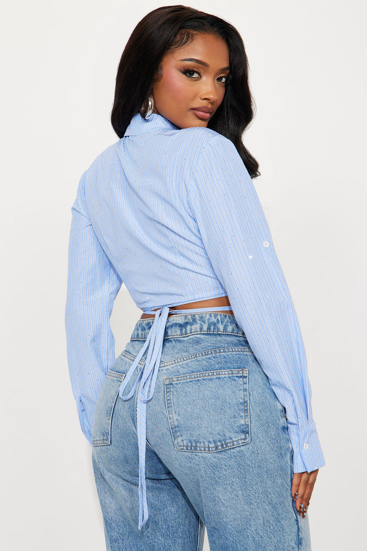 Available In Blue/combo. | Poplin Shirt | Striped | Button Up | Rhinestone | Front Pockets | Tie Waist | Disclaimer Rhinestone Placement May Vary | Shell: 50% Cotton 50% Polyester | Imported
