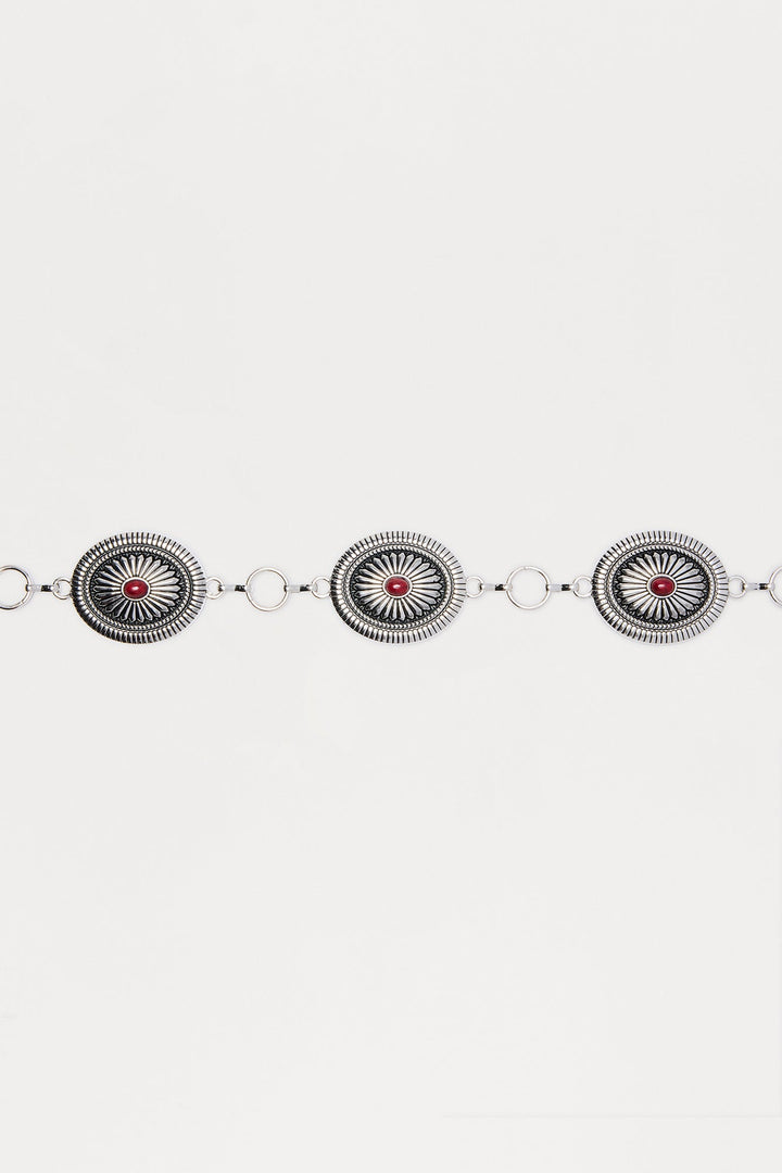 Available In Silver/Blue And Silver/Red. | Chain Belt | Intricate Concho Design | Lobster Clasp Closure | Length: 44" | Imported