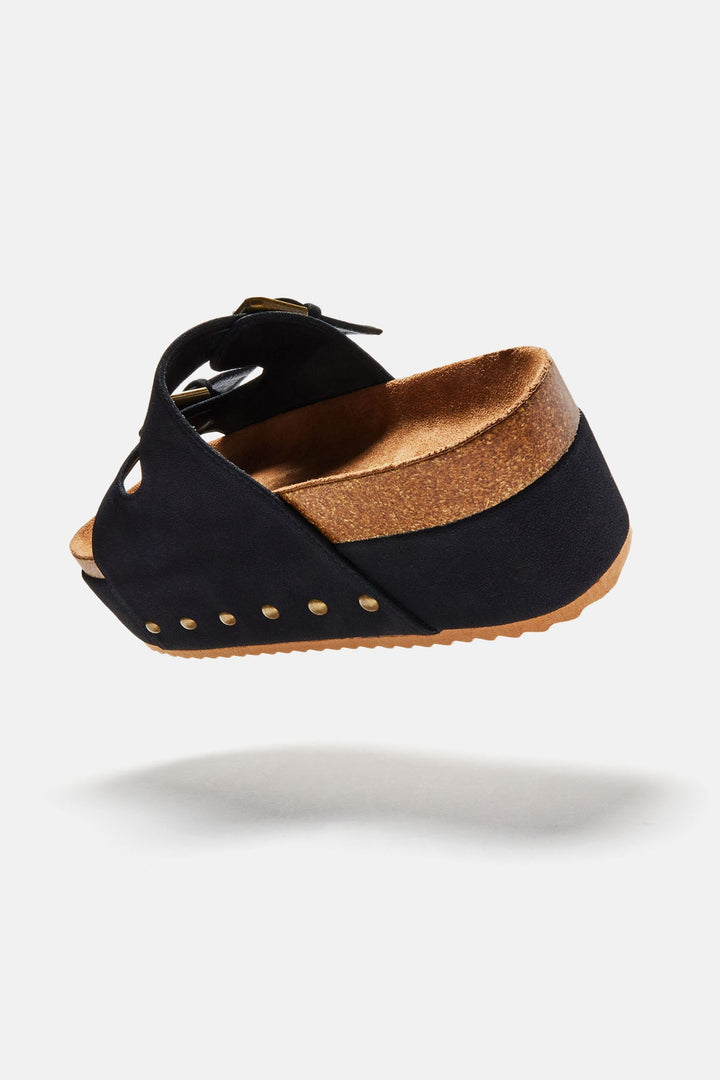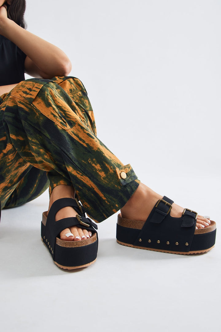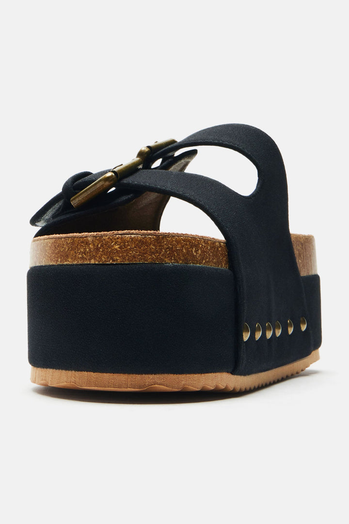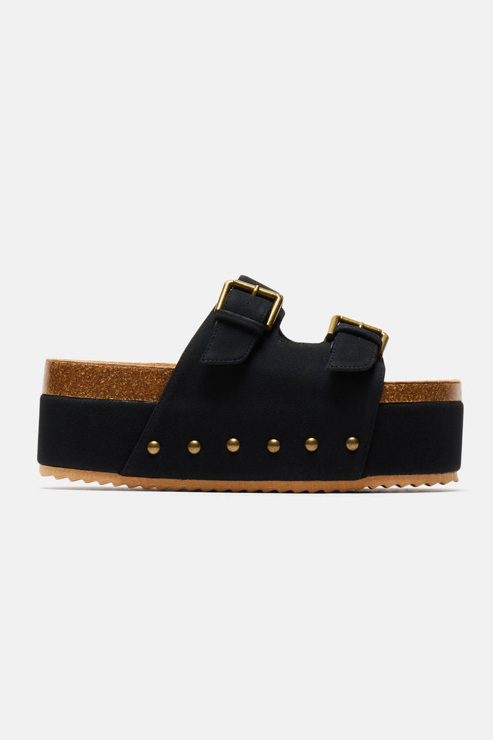 Available In Black And Nude. | Flatform Sandals | Studded Detail | Buckle Detail | Round Toe | 2.5" Flatform Mid Heel | Imported