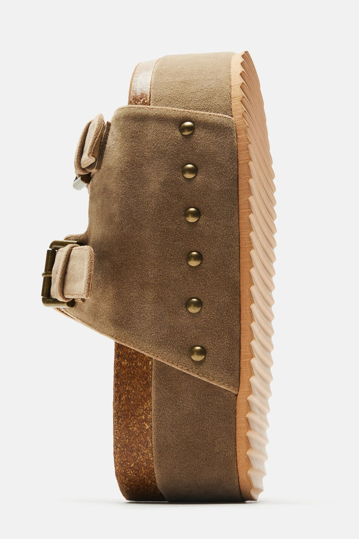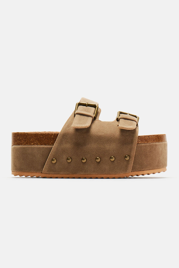 Available In Black And Nude. | Flatform Sandals | Studded Detail | Buckle Detail | Round Toe | 2.5" Flatform Mid Heel | Imported