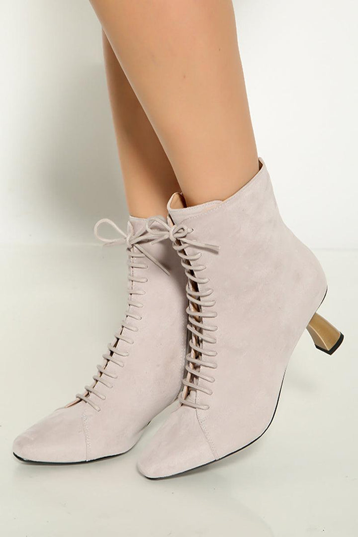 Gray Suede Single Sole Gold Chunky Heel Booties. Featuring side zipper making it easy to put on and take off. 2 inch approximate heel