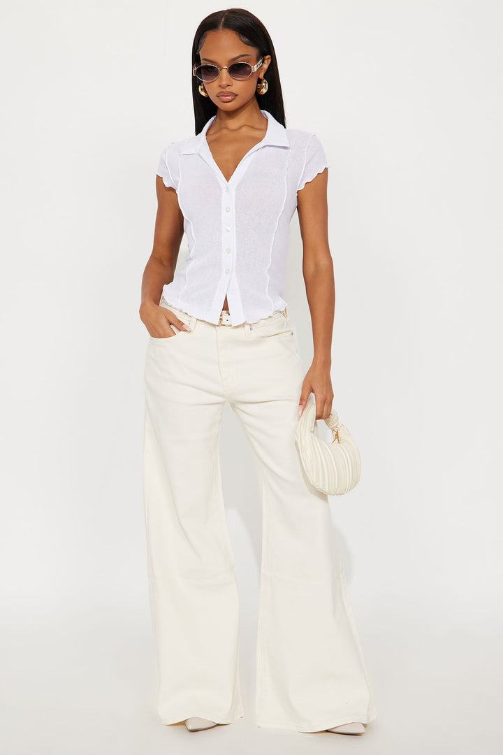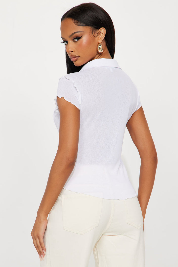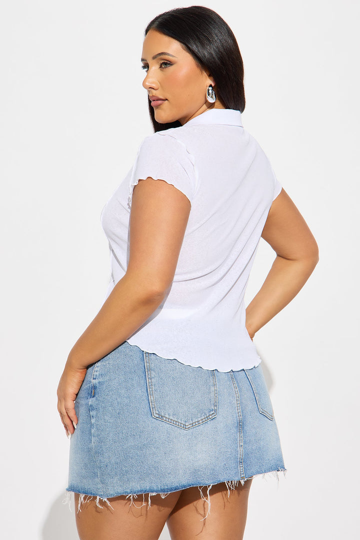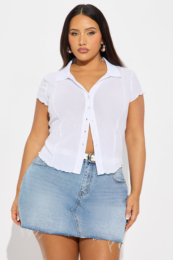 Available In White. | Short Sleeve Shirt | Stretch | Collar | Button Up Detail | Seaming | 100% Polyester | Imported