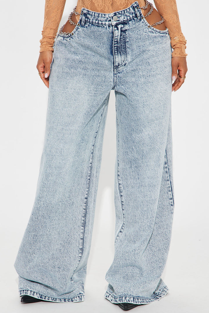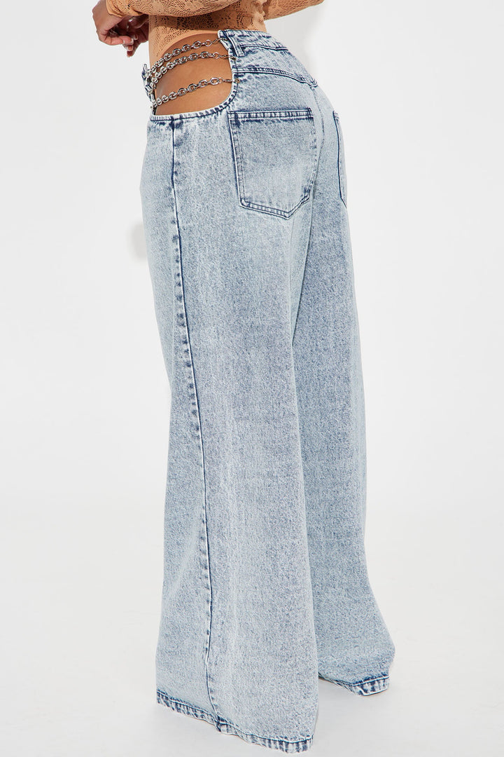 Available In Light Wash. | Jeans | Cut Out | Chain Hardware Detail | Low Rise | Non Stretch | Inseam = 32" | Disclaimer: Due To The Specialized Wash Process, Each Garment Is Unique. | Self: 90% Cotton 10% Polyester | Imported