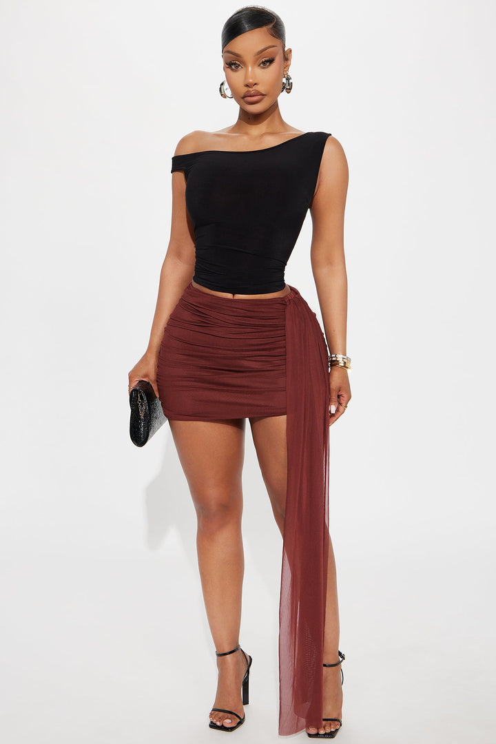 Available In Black And Burgundy. | Top | Off Shoulder | Ruched | Open Back | Cut Out | Hardware | Stretch | Self: 95% Polyester 5% Spandex | Imported