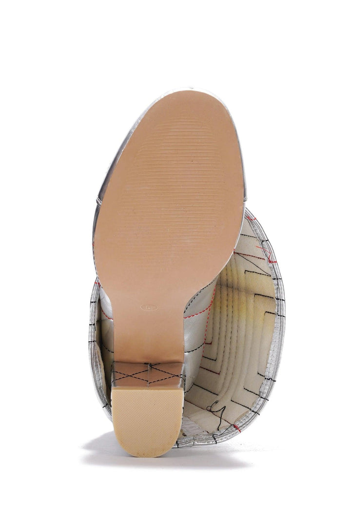 INITIAL - SILVER - BOOTS by CAPE ROBBIN round toe high block heel fold-over thigh-high boots multicolor stitching on shaft diamond stitching buckle decor metallic PU These fold-over thigh-high boots are a fetch! Unique in its own way,you'll be the star of the evening. Stay trendy in black or silver.
