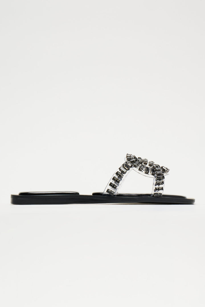 Available In Black. | Flat Sandals | Metallic | Jewel Embellishment | Square Toe | Flat Heel | Imported