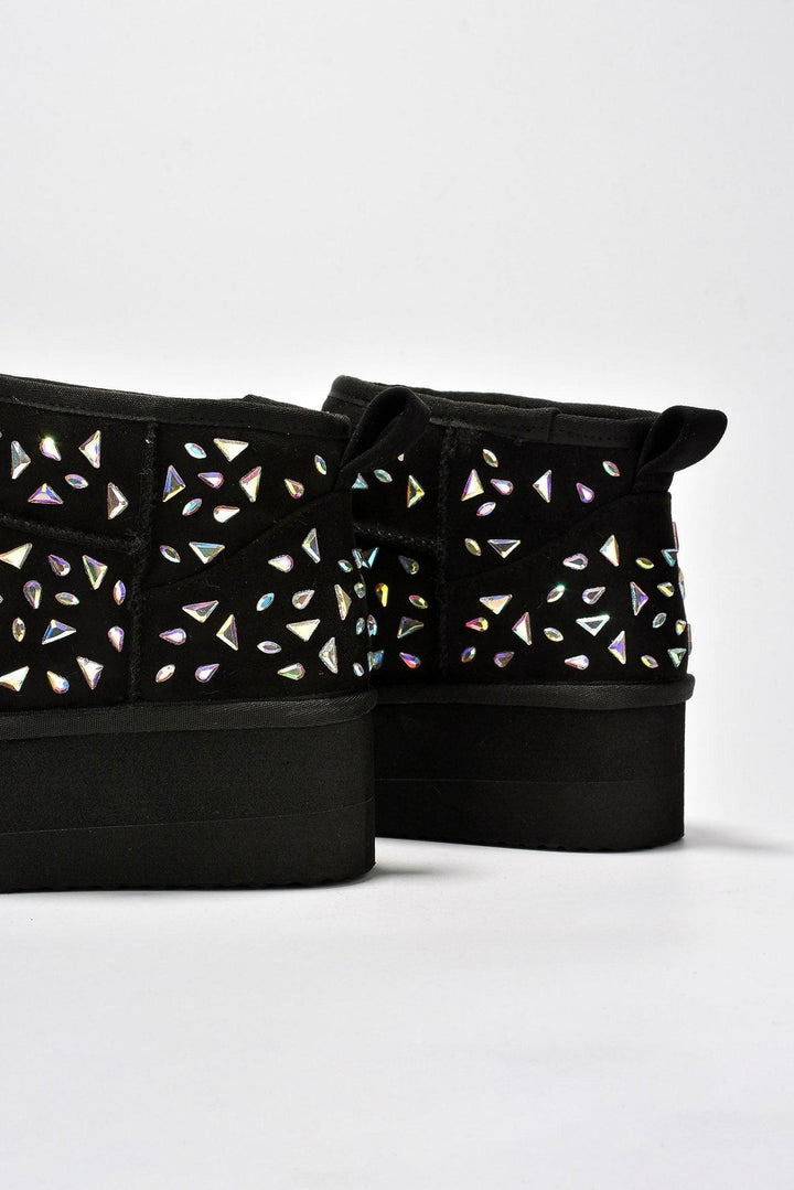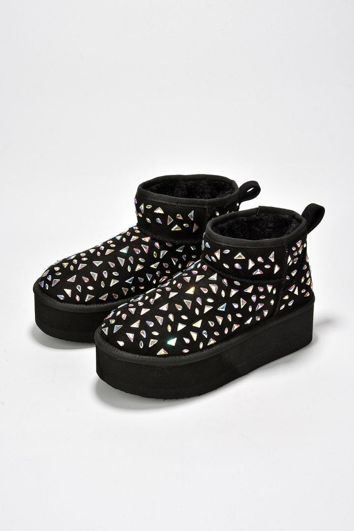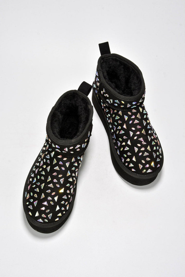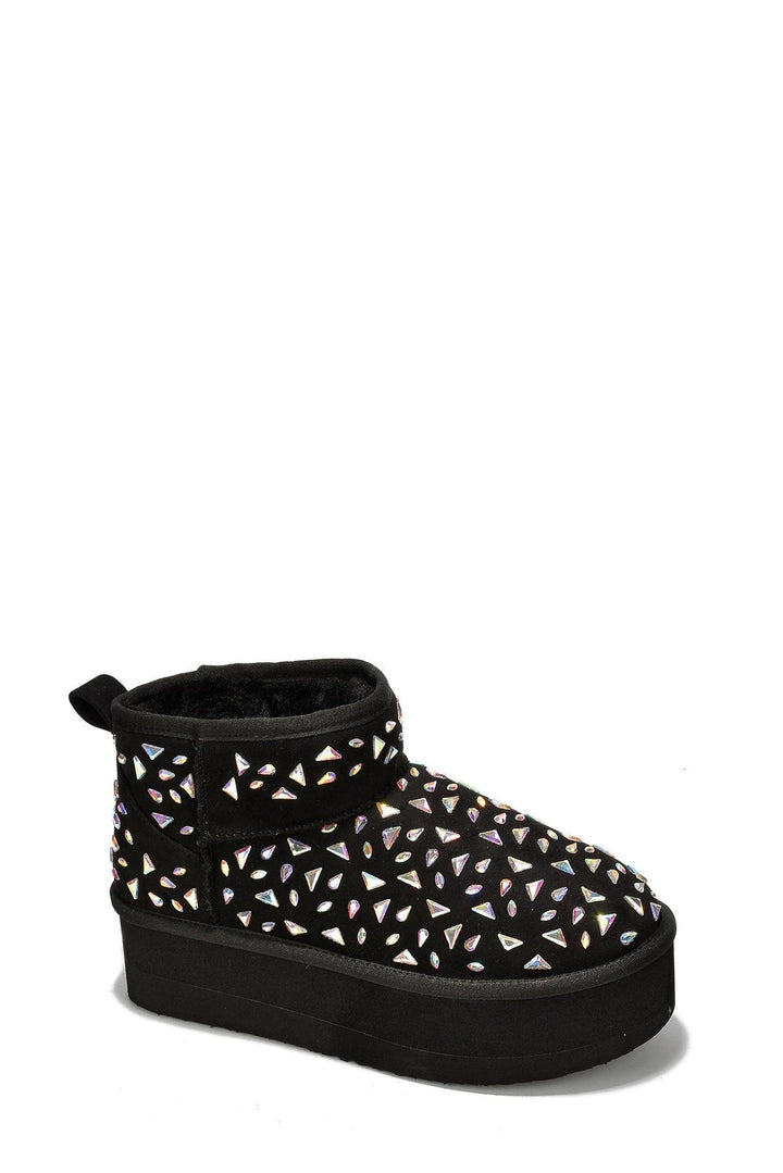 INTERBLE - BLACK - BOOTIES by CAPE ROBBIN round toe flat platform suede finish fur-lined rhinestone accent Keep your toesies warm and your wardrobe stylish with Interble! Features a lightweight design,velvety suede finish,sparkling rhinestone accents,and fur-lined interior. Plus,the platform gives you an extra boost! Perfect for those cool California winters. Comes in camel,black,or blue.