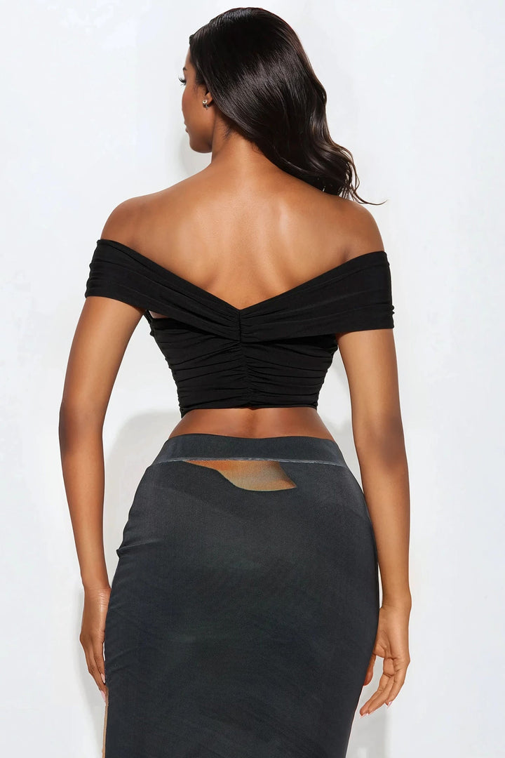 Available In Black And Purple. | Off Shoulder Top | Stretch | Padded | V-Wire | Ruched | Cropped | Self:95%Polyester 5%Spandex | Lining:100%Polyester | Imported