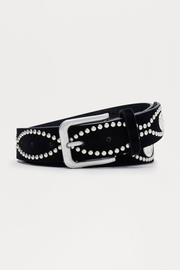 Available In Black/Silver And Silver/Brown. | Faux Suede Material | Studded Detail | Bull Detail | Length: 41" | Buckle: 100% Alloy Metal | Belt: 100% Polyurethane 50% Flannelette | Imported