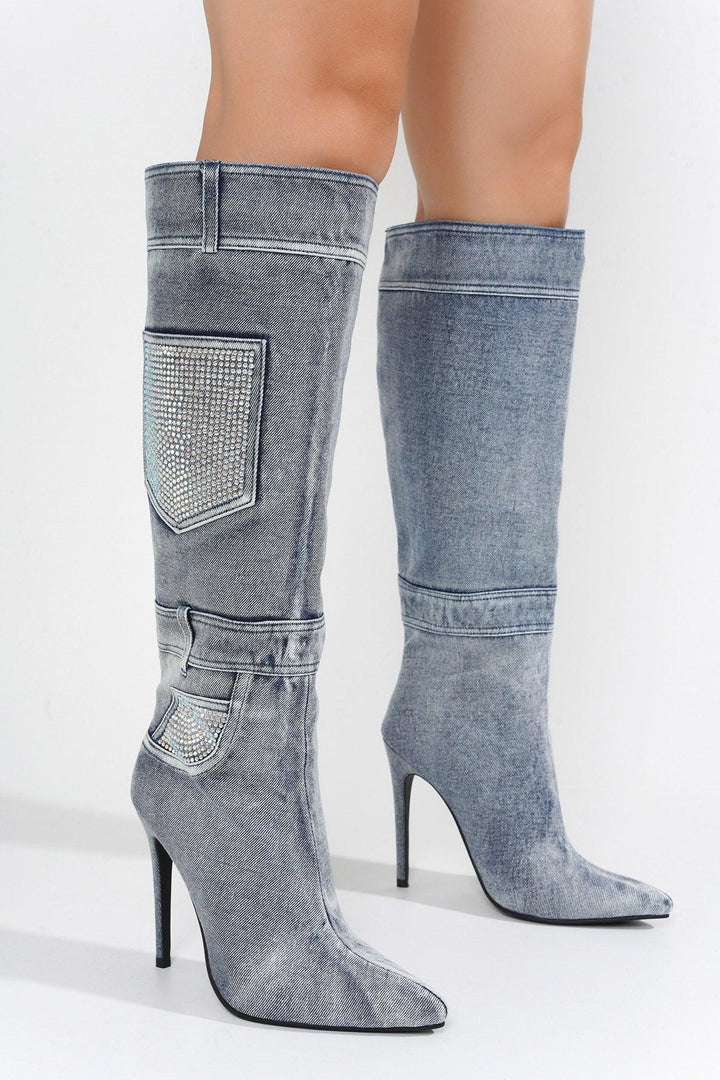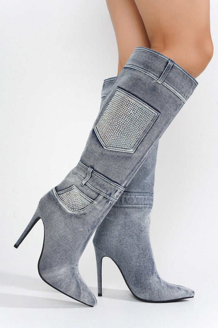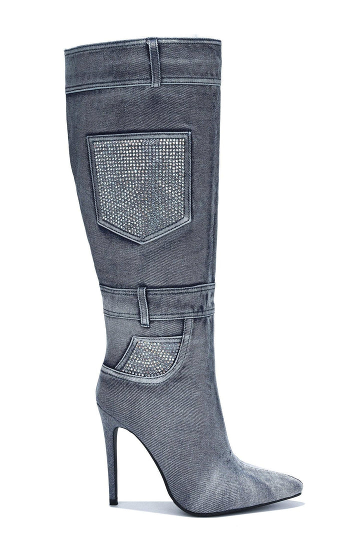 JACQUIE - DENIM - BOOTIES by CAPE ROBBIN closed pointy toe lightly cushioned footbed rubber outsole washed denim rhinestone trim knee-high Cape Robbin's Jacquie adds riveting sparkle to a timeless denim boot. Sits right below the knee,the soft,washed denim feels luxurious to the touch and looks effortlessly stunning wherever the night takes you.
