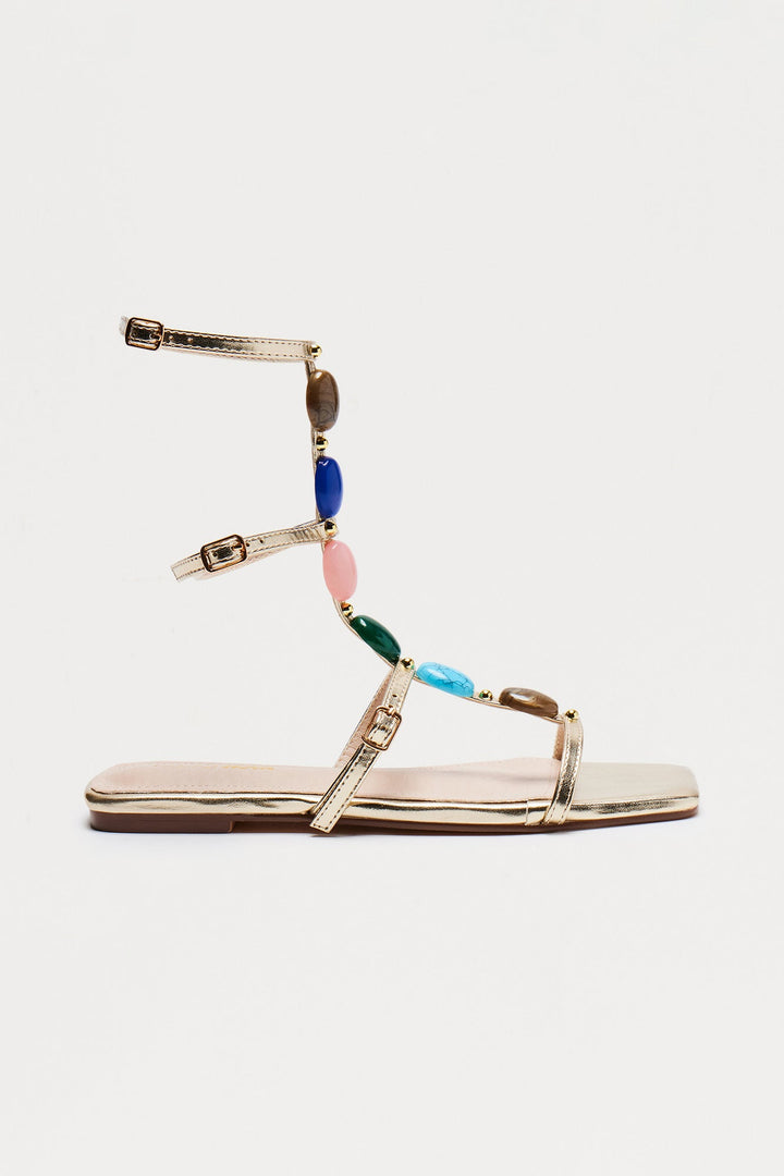 Available In Gold. | Gladiator Flat Sandals | Beaded Embellishment | Metallic | Square Toe | Flat Heel | Imported