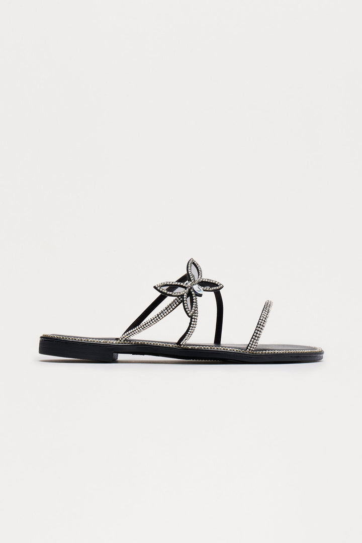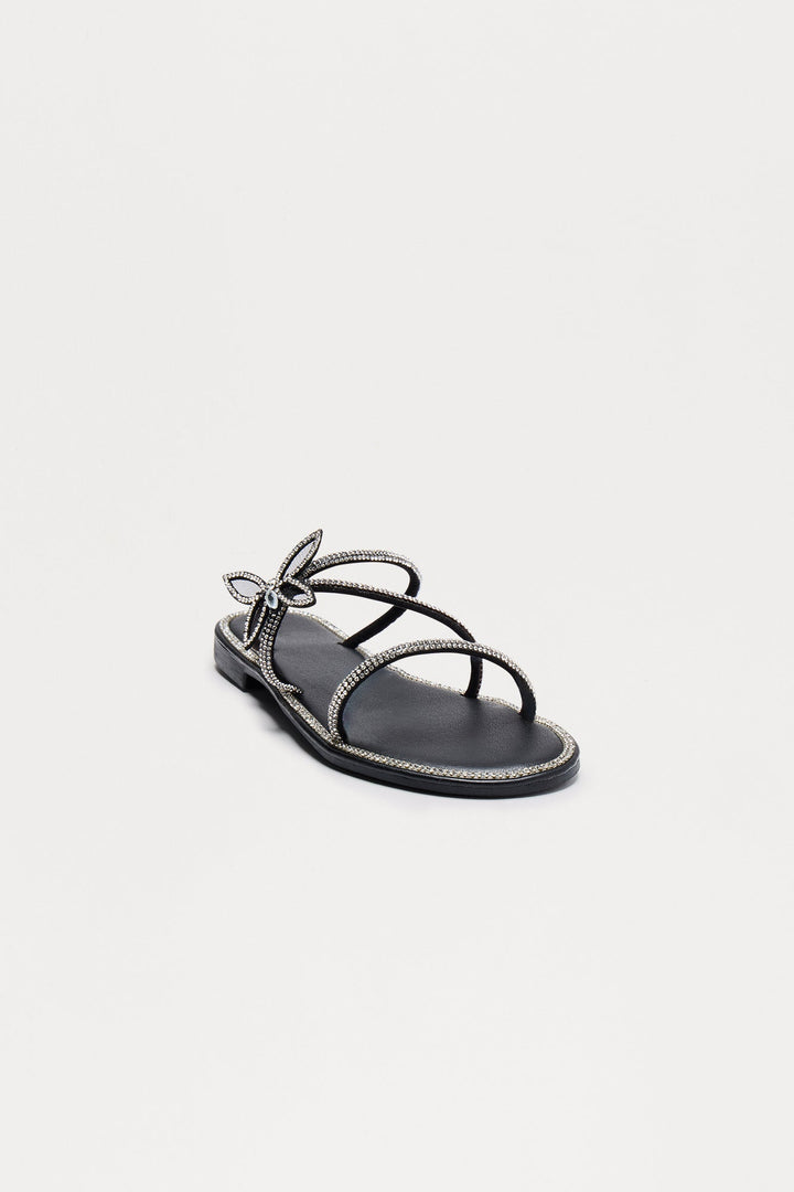 Available In Black And Rose Gold. | Flat Sandals | Rhinestone Trime | Butterfly 3D Applique | Round Toe | Flat Heel | Imported