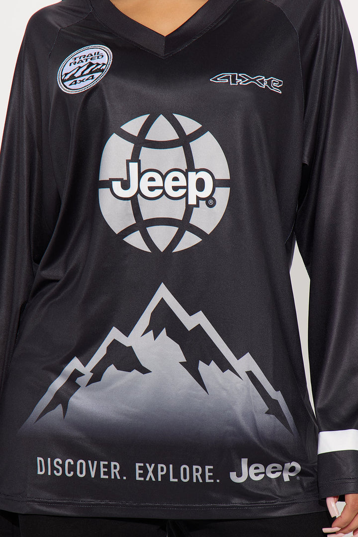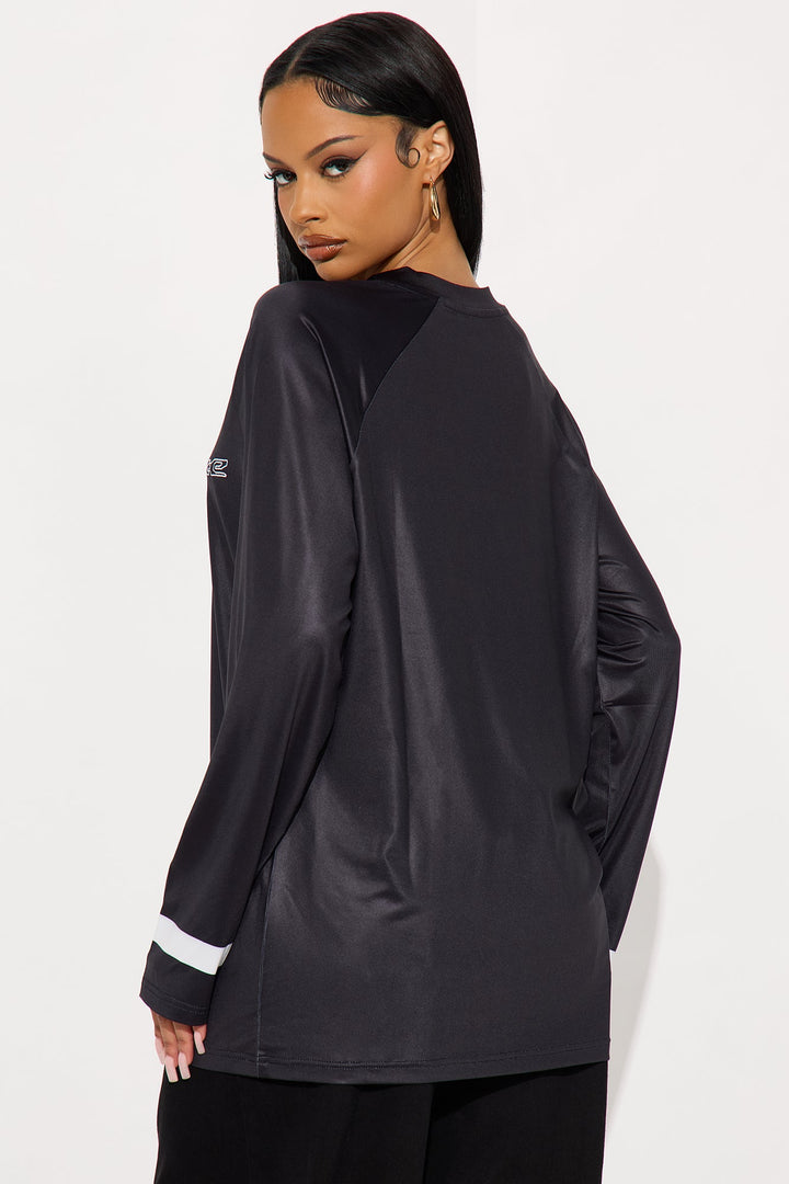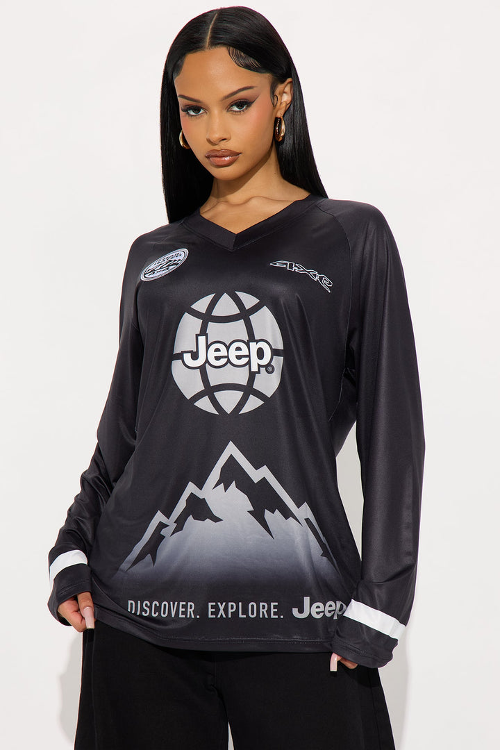 Available In Black. | Jersey | Stretch | Long Sleeve | V Neck | Front Screen | Disclaimer: Due To The Printing Process A Difference In Saturation May Occur. Each Garment Is Unique. | 87% Polyester 13% Spandex | Imported