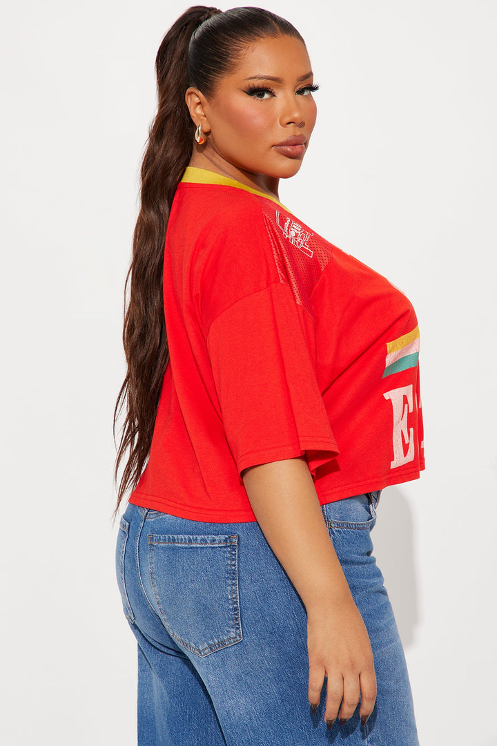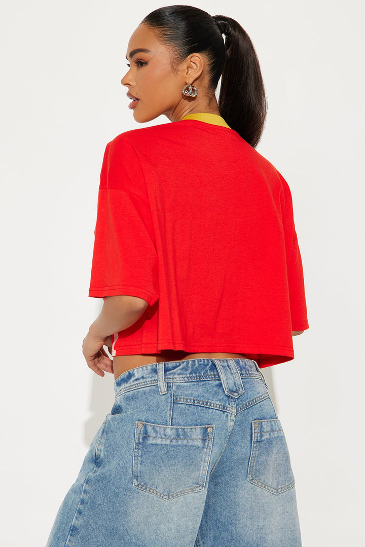 Available In Red. | V-Neck | Short Sleeve | Front Screen | Cropped | Stretch | Disclaimer: Due To The Printing Process A Difference In Saturation May Occur, each Garment Is Unique. | Body: 60% Cotton 40% Polyester | Contrast: 100% Polyester | Imported