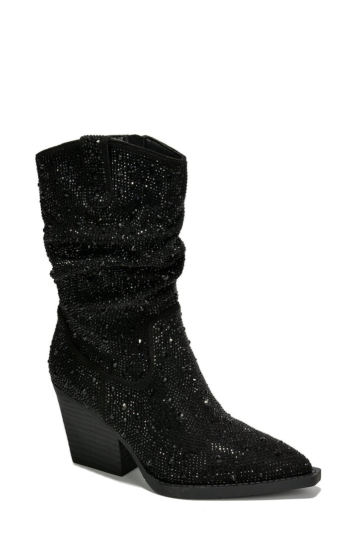 JEHANNA - BLACK - BOOTIES by CAPE ROBBIN Closed Pointy Toe 3.5 Inch Western Block Heel Rhinestone Embellished PU Leather Upper Side Zipper Jehanna Booties offer a blend of elegance,comfort,and glamour. A must-have addition to your footwear collection. Elevate your fashion game and make a statement with every step you take. Crafted with meticulous attention to detail