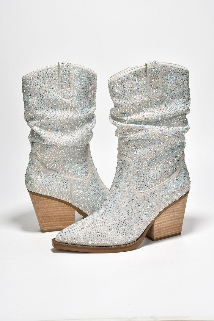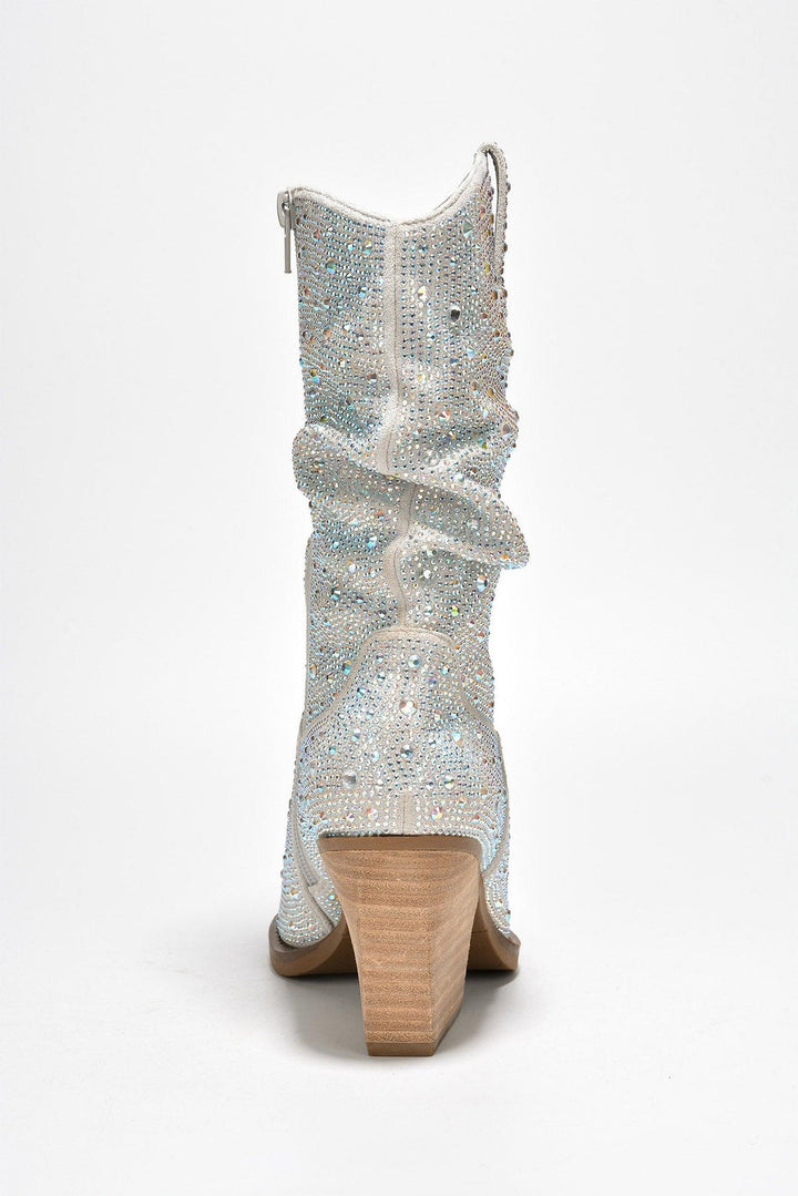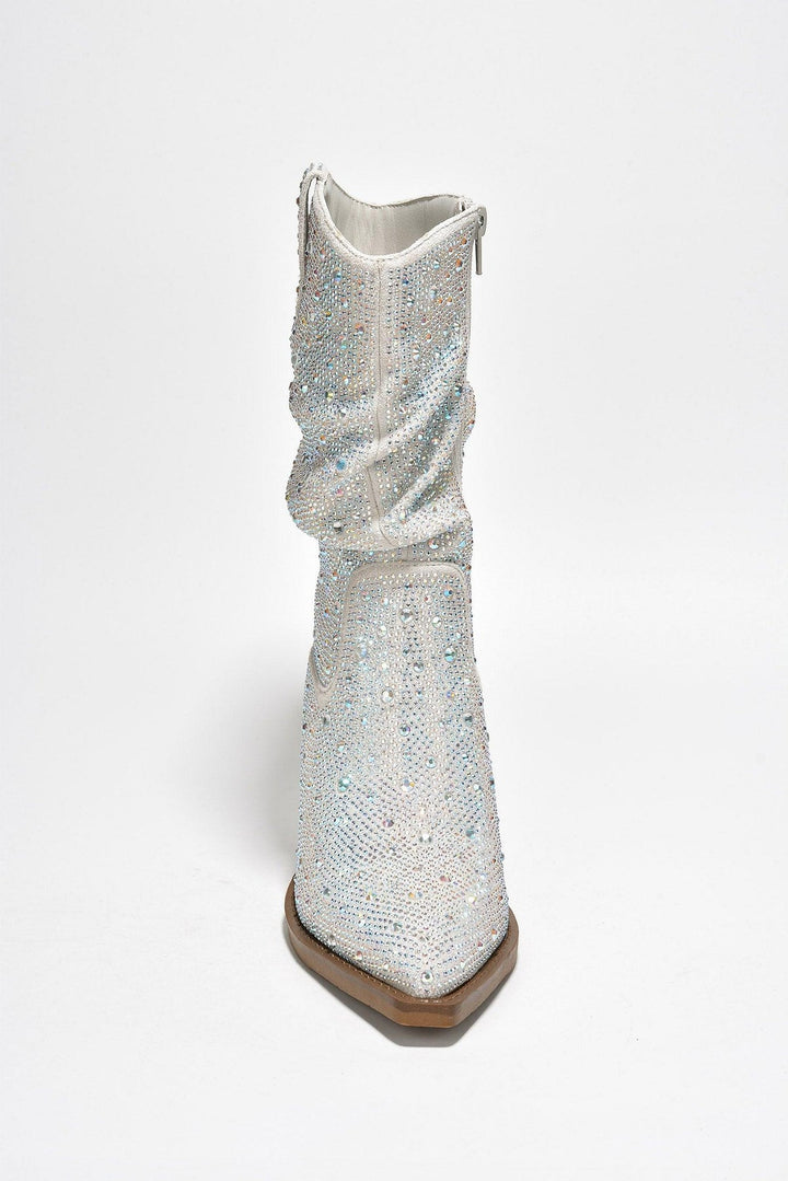 JEHANNA - SILVER - BOOTIES by CAPE ROBBIN Closed Pointy Toe 3.5 Inch Western Block Heel Rhinestone Embellished PU Leather Upper Side Zipper Jehanna Booties offer a blend of elegance,comfort,and glamour. A must-have addition to your footwear collection. Elevate your fashion game and make a statement with every step you take. Crafted with meticulous attention to detail
