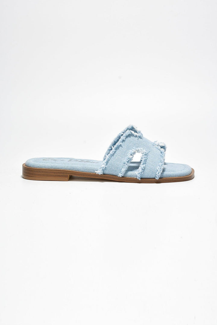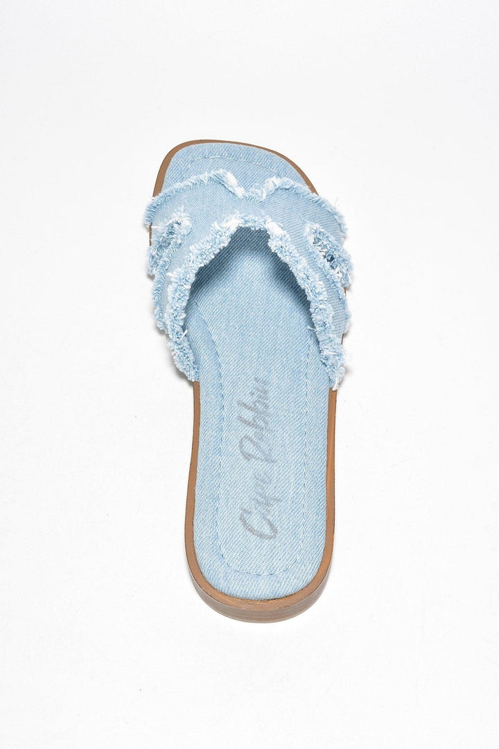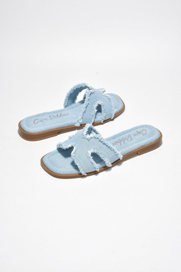 JENJEN - DENIM - SANDALS by CAPE ROBBIN Open Toe Frayed Denim Upper PU Leather Insole with Memory Foam The trendy Jenjen sandals feature a frayed denim upper,adding a touch of edge to your summer wardrobe. Perfect for those who want to make a statement,these sandals combine style and comfort effortlessly.