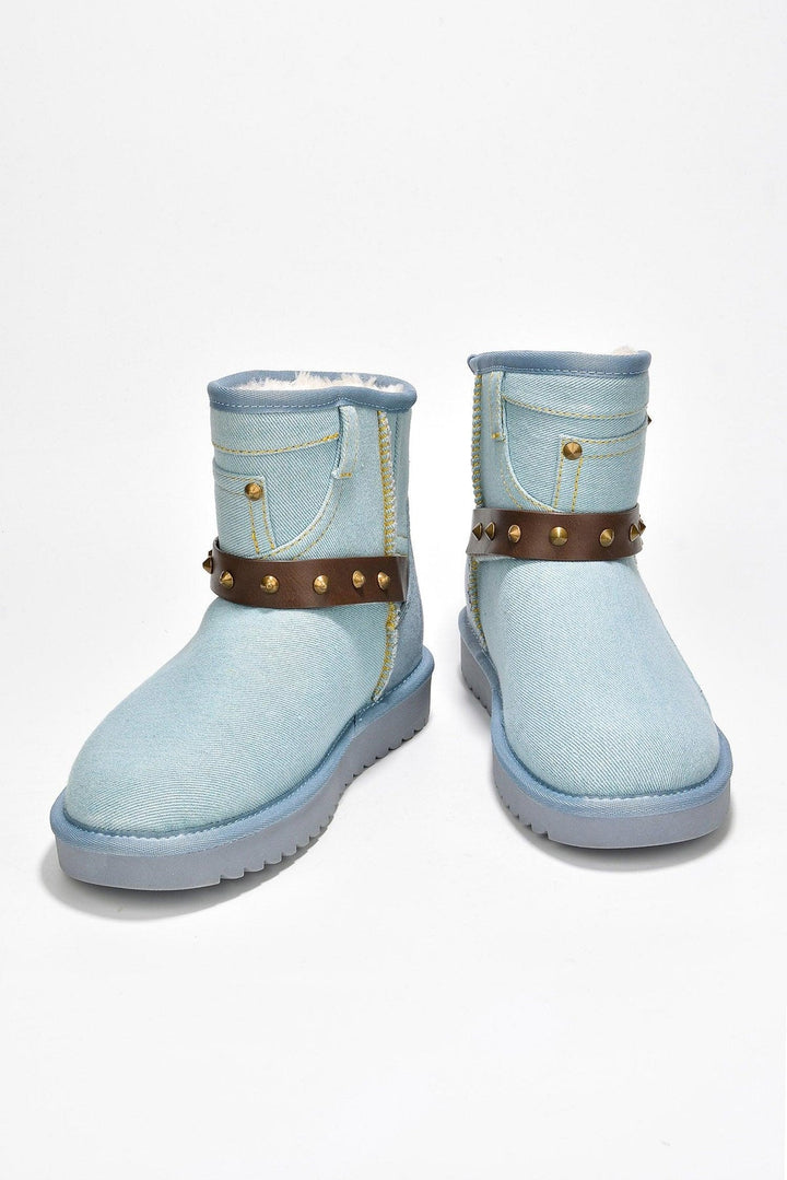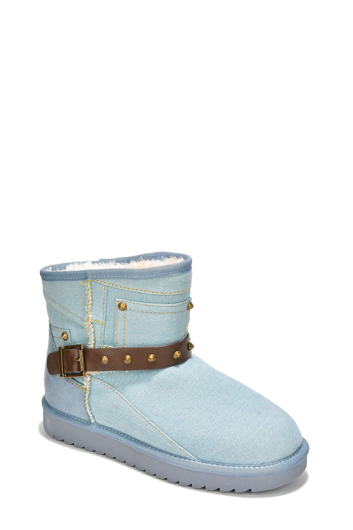 JINSOLE - BLUE - BOOTIES by CAPE ROBBIN round toe denim finish fur-lined studs trimmed strap detailing with studs trim lug sole Keep your toes cozy and your style busting in these Jinsole ankle booties. Features a fuzzy fur-lined interior for pure warmth on chilly days,a lug sole for on-the-go traction wherever life takes you,and a premium denim finish for an edgy,high-end look.