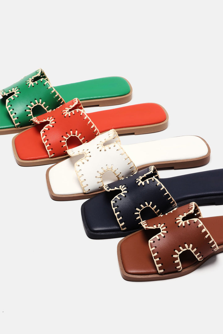 Available In Tan And White. | Flat Sandals | Stitching Detail | Square Toe | Flat Heel | Imported