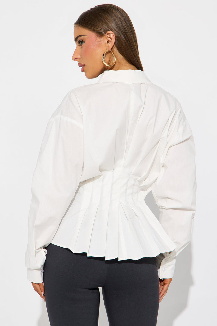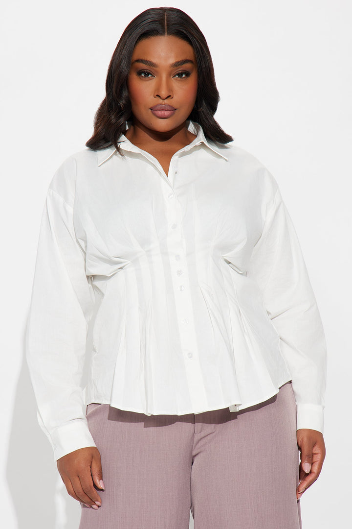 Available In Taupe And White. | Poplin Shirt | Button Up | Pleated Detail | Cinched Waist | Non Stretch | Self : 97% Cotton 3% Spandex | Imported