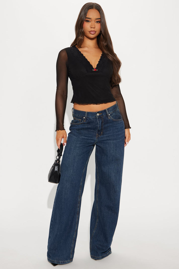 Kara Long Sleeve Lace Trim Baby Tee - Black