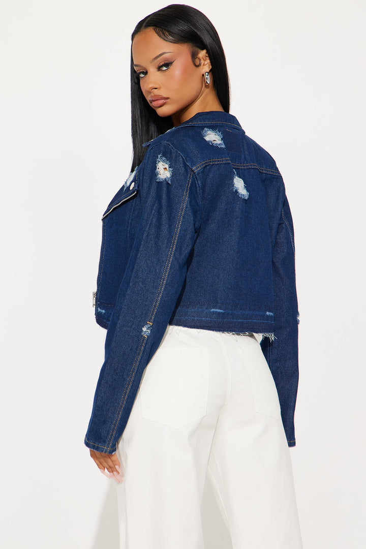 Keep Riding Distressed Moto Denim Jacket - Dark Wash