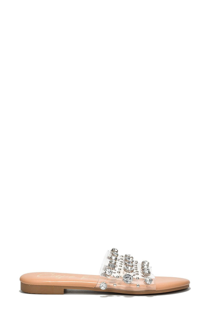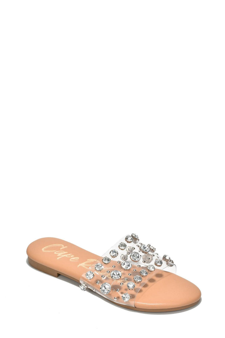 KLON - CLEAR - SANDALS by CAPE ROBBIN small studs rhinestones gems clear upper PU flat sandals wide foot friendly flat footbed These Klon sandals are perfect for any occasion! The small studs,rhinestones,and gems give them a fun and stylish look and work well with any outfit.
