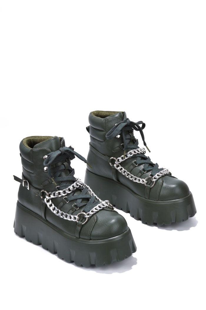 KRISTAN - GREEN - BOOTIES by CAPE ROBBIN round toe 7-hole lace up chunky platform lug boots chain trim Kristan boots are a fashionable statement piece that will make any outfit stand out. Features a 7-hole lace up design with chunky platform and lug sole for extra height and comfort. The boots are finished off with a chain trim for added style. These boots are fashion and function reimagined. Blue,green,brown.