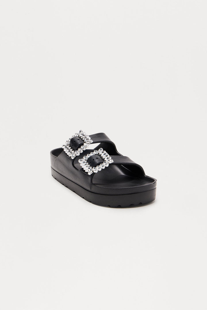 Available In Black And White. | Flat Sandals | Jewel Embellishment | Round Toe | Flat Heel | Imported