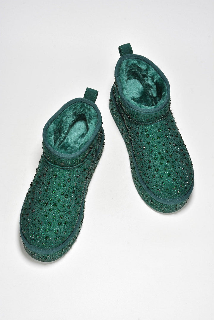KYUMI - GREEN - BOOTIES by CAPE ROBBIN closed round toe faux fur lining rubber outsole suede finish rhinestone trim true to size platform lug sole pull tabs It's sweater weather season! Cozy up with Cape Robbin's Kyumi ankle booties. Keep your toesies warm and your style game shimmeringly on point.