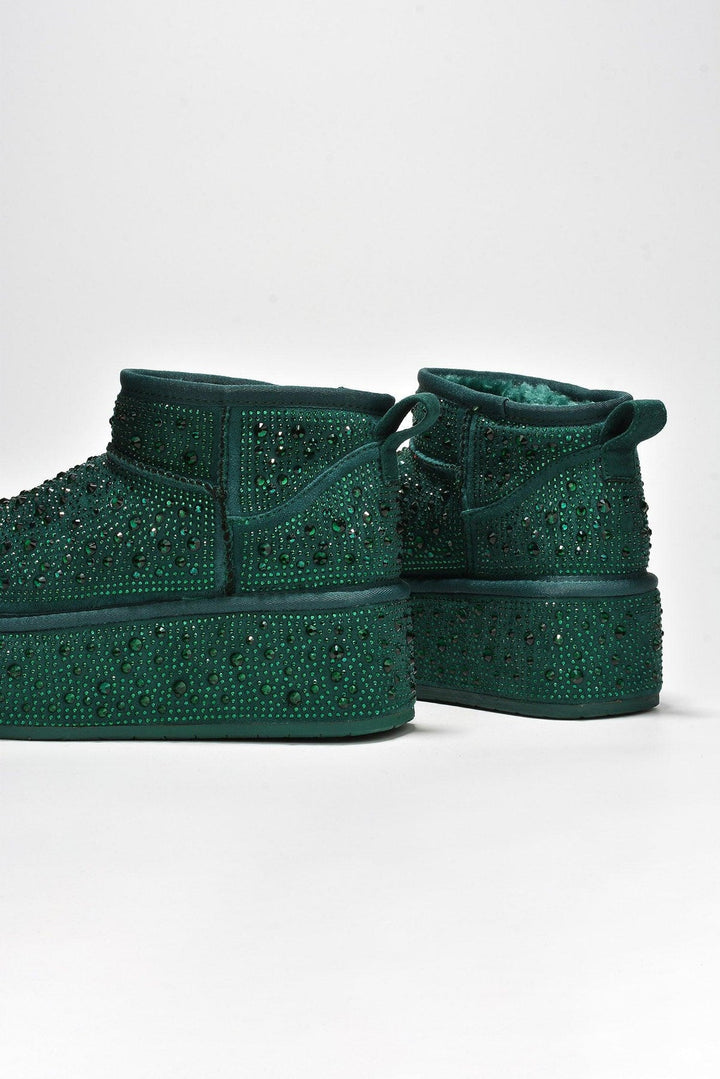 KYUMI - GREEN - BOOTIES by CAPE ROBBIN closed round toe faux fur lining rubber outsole suede finish rhinestone trim true to size platform lug sole pull tabs It's sweater weather season! Cozy up with Cape Robbin's Kyumi ankle booties. Keep your toesies warm and your style game shimmeringly on point.