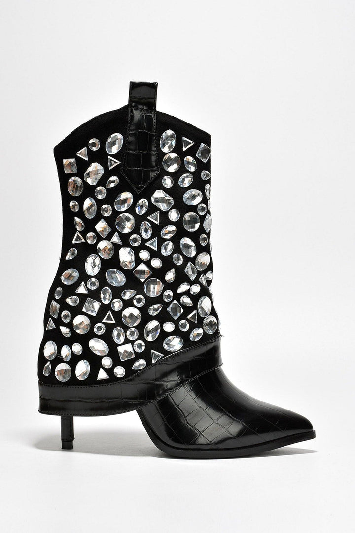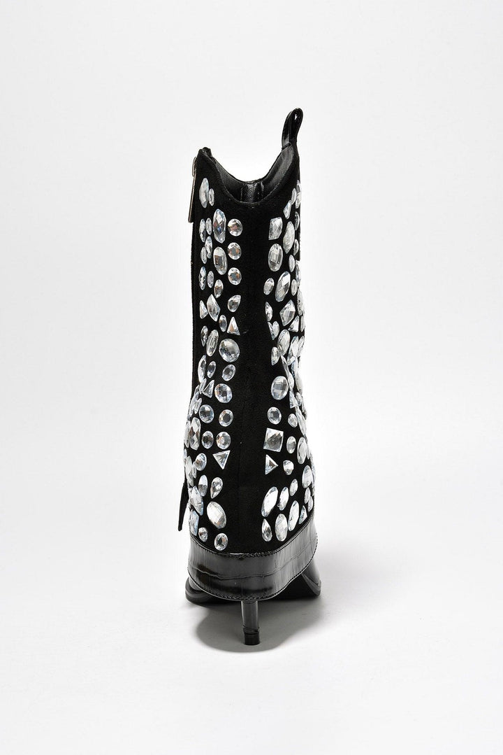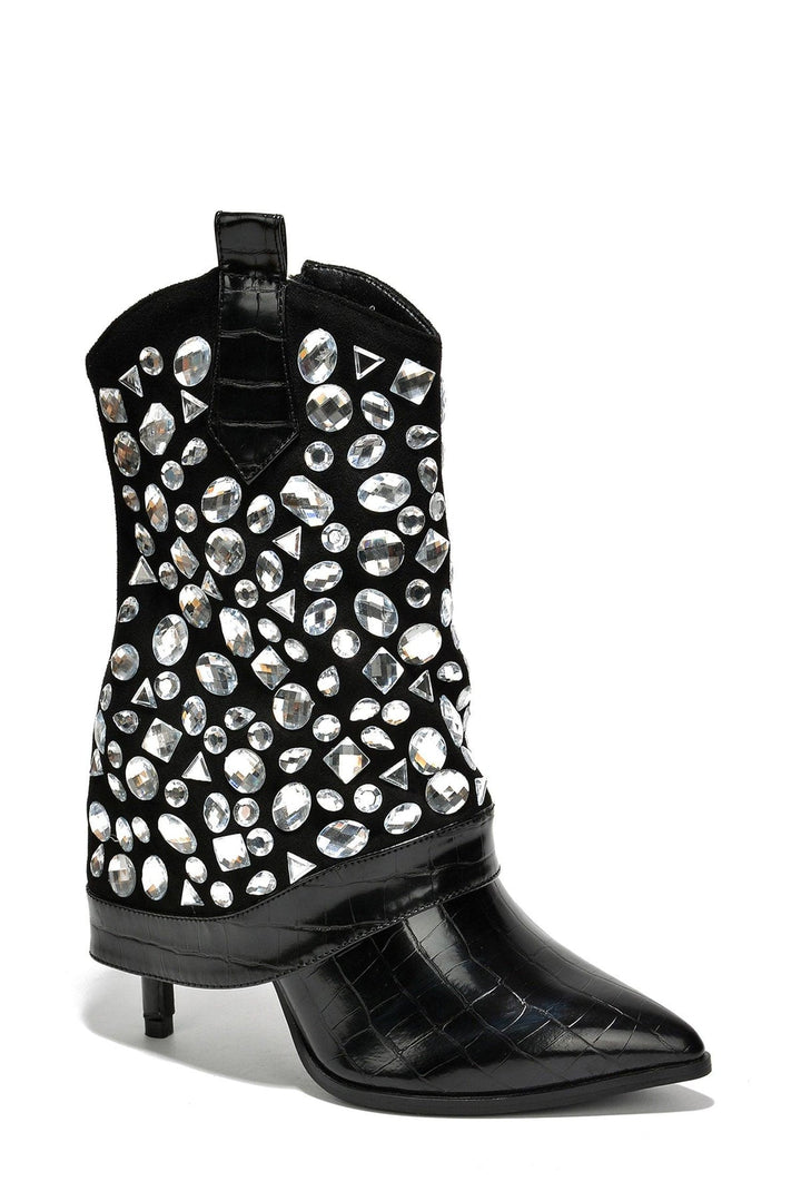 LAGUANA - BLACK - BOOTS by CAPE ROBBIN pointy toe ~3 inch heels fold-over pull tabs croc finish boots PU suede rhinestone crystal gem embellishment lightly cushioned footbed rubber outsole These crocodile-skin boots are full of rizz. You'll charm your way through anything,anywhere the night takes you.