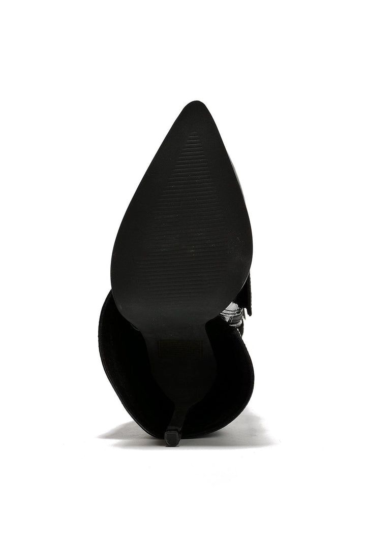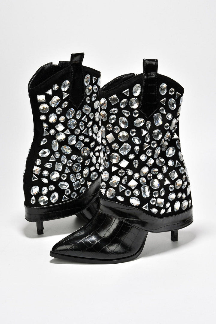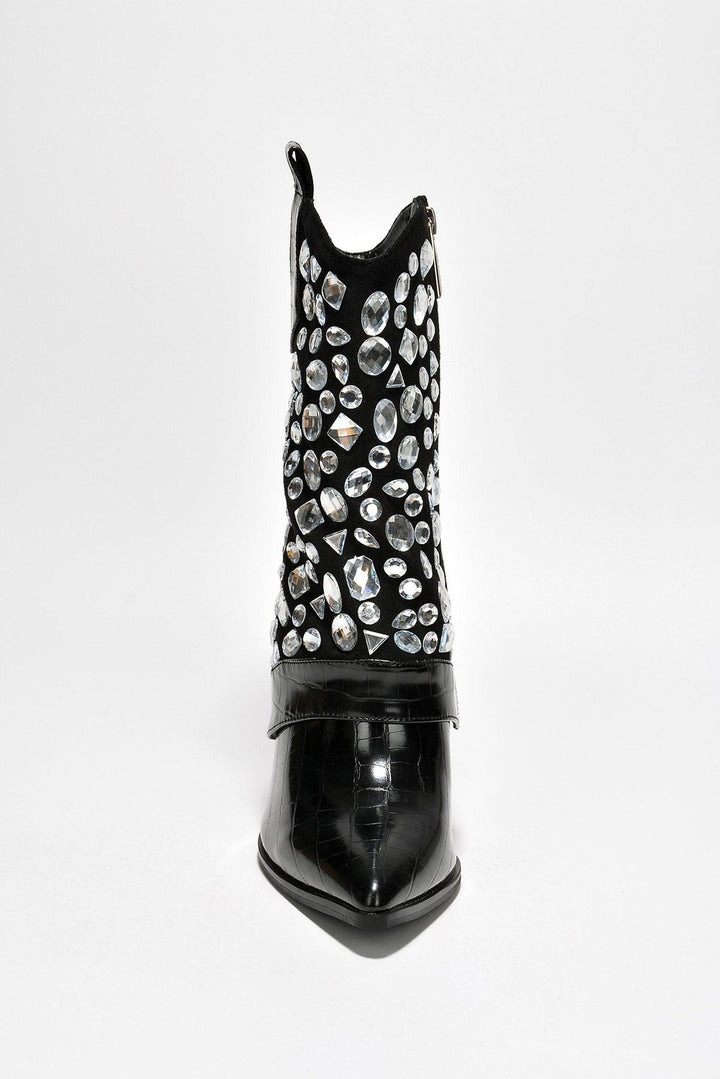 LAGUANA - BLACK - BOOTS by CAPE ROBBIN pointy toe ~3 inch heels fold-over pull tabs croc finish boots PU suede rhinestone crystal gem embellishment lightly cushioned footbed rubber outsole These crocodile-skin boots are full of rizz. You'll charm your way through anything,anywhere the night takes you.